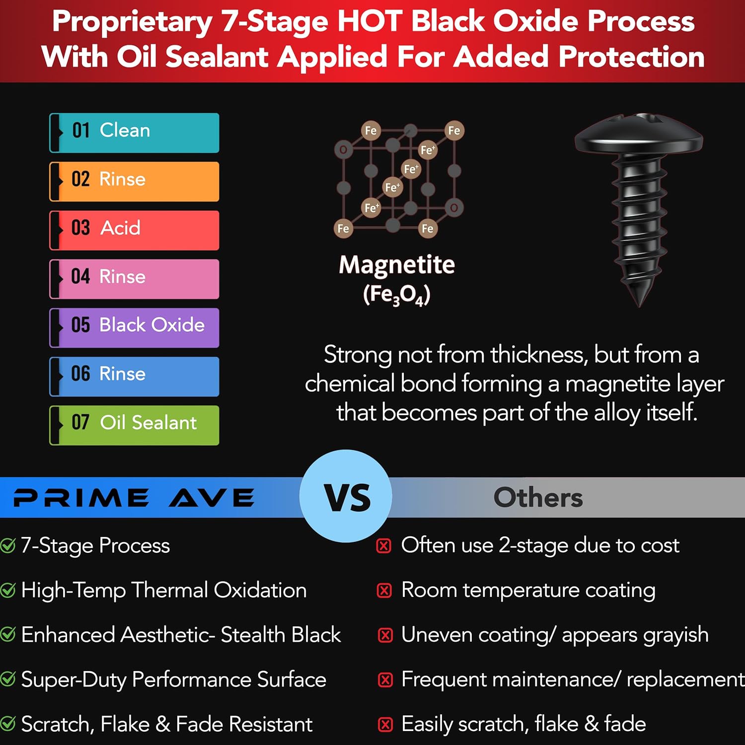 - Stainless Steel with HOT Black Oxide Coating: Made from premium stainless steel, each screw undergoes a proprietary 7-stage HOT black oxide treatment at 250°F. The process penetrates the surface to strengthen the alloy and deliver a sleek, high-performance black finish. A final oil sealant boosts corrosion resistance, reduces friction, and prevents galling under load. Our license plate fasteners are engineered to withstand the harshest weather — from driving rain and snow to corrosive salty roads. Built for unmatched durability, our screw for license plate deliver superior rust resistance while keeping your front or rear plates firmly secured, mile after mile.