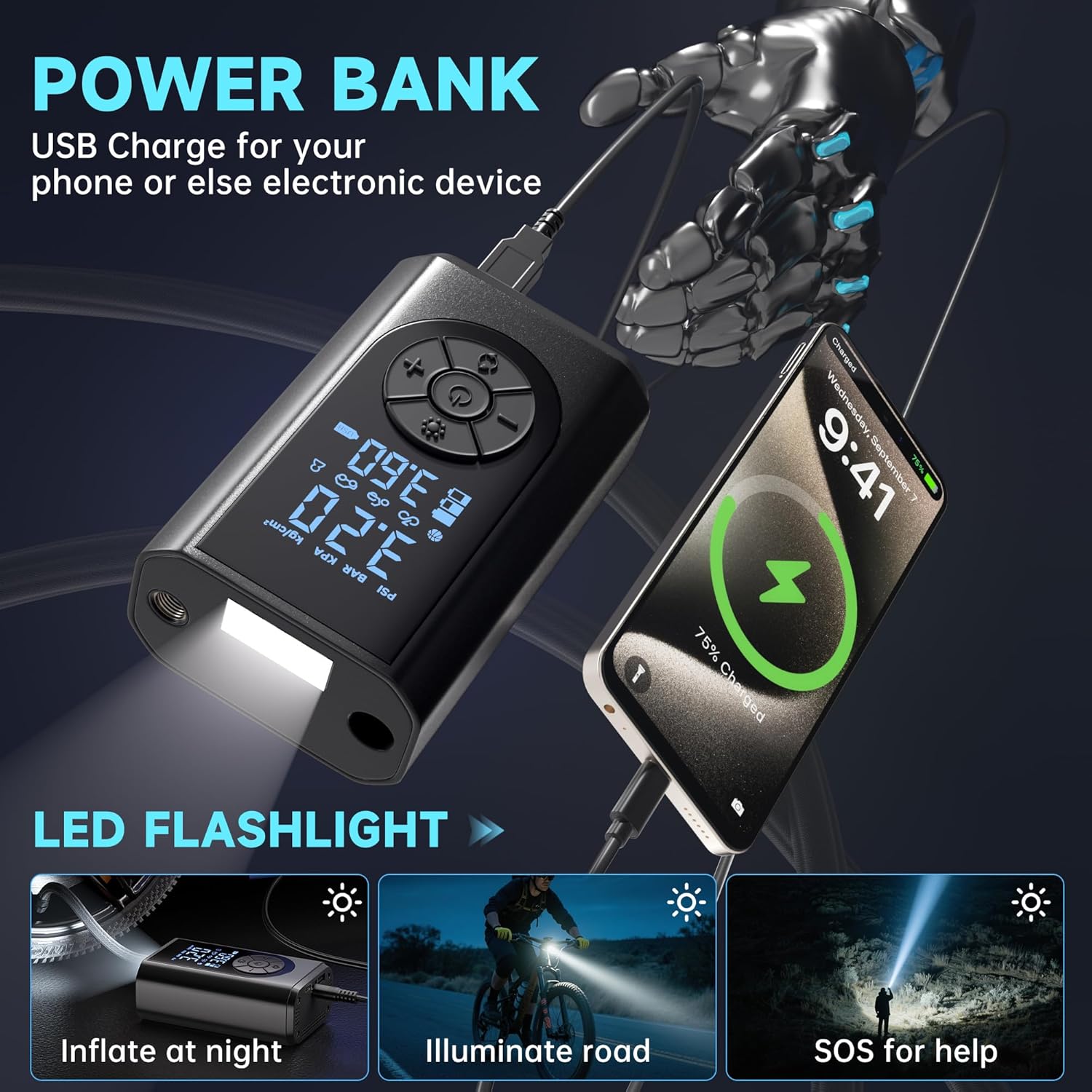 - Multi-Functional Emergency Tool - LED Light & Type-C Power Bank Built-in LED flashlight with 3 modes (steady/SOS/strobe) for nighttime emergencies or tire changes 5V Type-C output port can charge phones/tablets (compatible with iPhone/Android) 20cm reinforced hose + 4 nozzles (Schrader/Presta/ball needle/general adapter) for all inflation needs