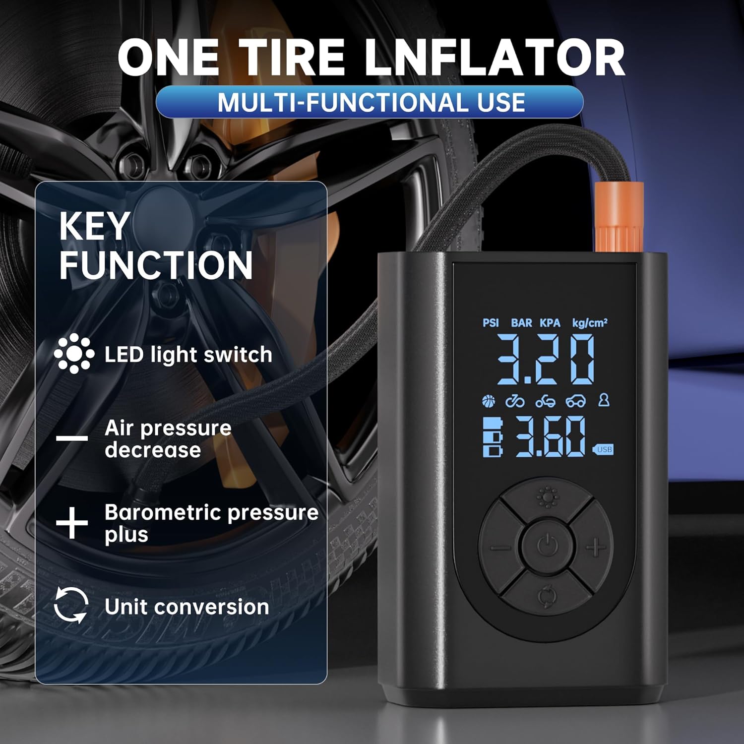 - Smart Auto Shut-Off & Precision LCD Display Auto-stop technology instantly shuts off when reaching preset pressure (3-150PSI), preventing over-inflation Large LCD screen shows real-time pressure in 4 units (PSI/KPA/BAR/KG/CM²) with ±0.1PSI accuracy Preset modes for cars (30-50PSI), motorcycles (26-43PSI), bikes (30-65PSI), and balls (4-16PSI)
