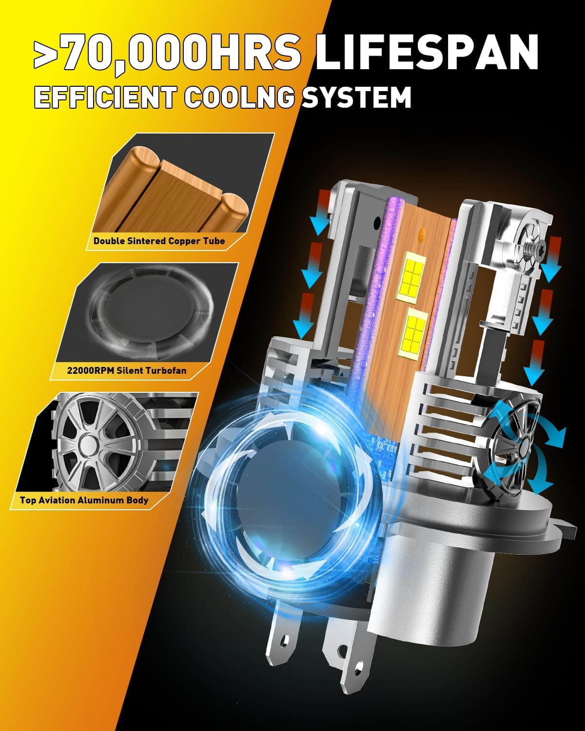 - 【ENHANCED DURABILITY】 - Designed to withstand extreme weather conditions and rigorous use, these H4/9003 fog bulbs are made of premium aerospace grade aluminum for long-lasting performance and reliability. Featuring a 22,000 RPM high-speed cooling fan, Termitor H4 bulbs provide exceptional cooling and boast over 70,000 hours of stable and continuous operation