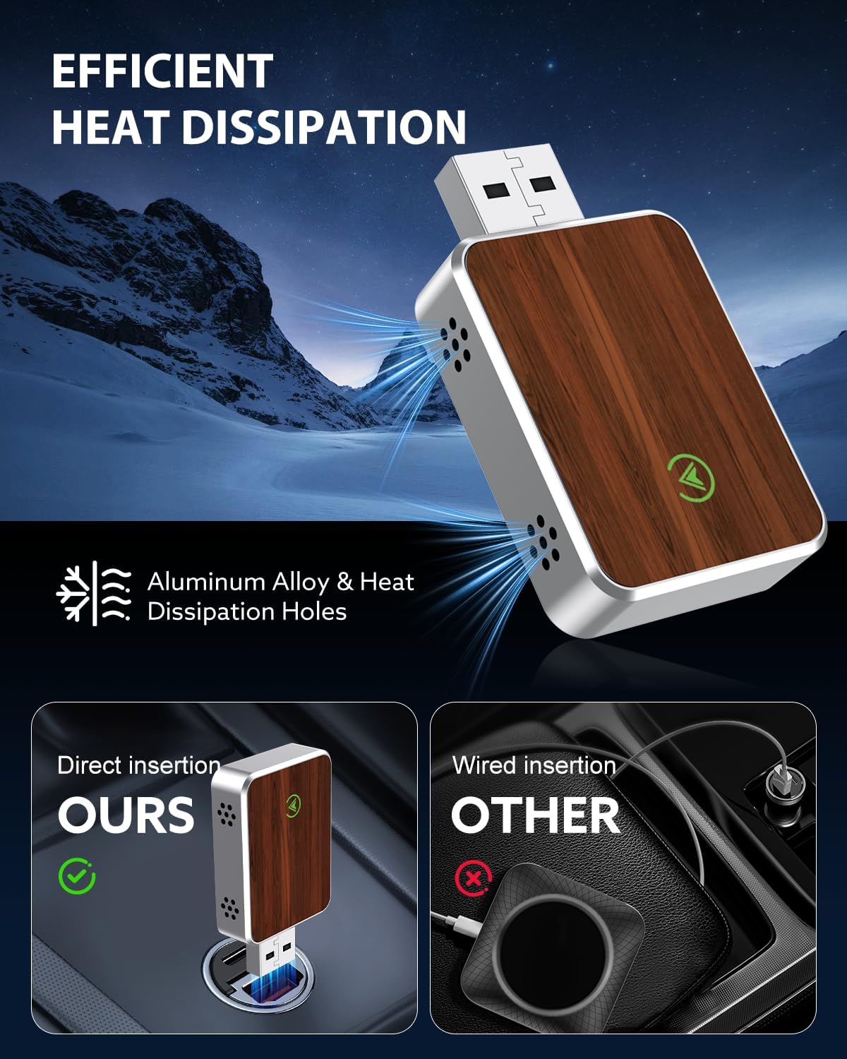 - Seamless Wireless Upgrade: Instantly convert your factory-wired CarPlay into a clean, wireless system with this premium adapter featuring a silver aluminum frame and smooth wood grain surface. It retains full functionalityânavigation, music, Siri, callsâvia your carâs original CarPlay interface. Enjoy cable-free convenience and a polished look that blends into modern interiors without requiring any app or permanent installation.