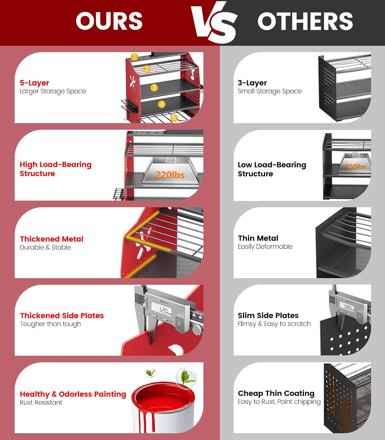 - γHeight Adjustment Tool Storage RackγThis garage tool organizer wall mount is designed with a 5-tier high-capacity storage system and with adjustable shelf heights, providing ample space for organizing your essential tools. The bottom tier securely holds up to 4 cordless drills, along with 4 additional hooks for various tools. The middle three tiers offer flexible storage for tools and accessories, including a side-mounted screwdriver holder and screw organizer box. The top shelf integrates a power outlet and drill holder wall mount for easy access to your frequently used equipment.