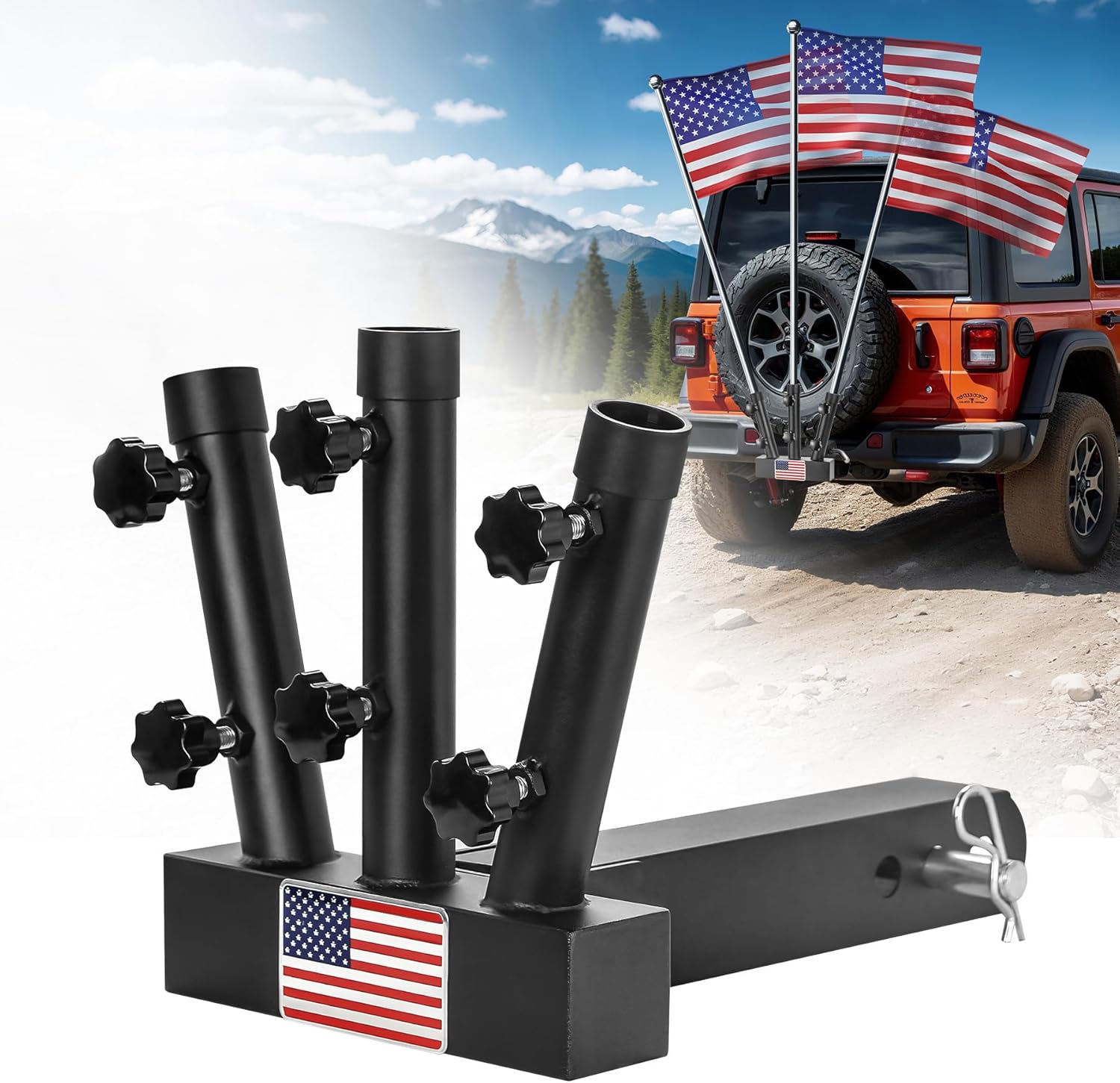 - Upgraded Design - Hitch flag pole holder features three poles and a unique hollow flag design to show national pride. The three-pole design allows you to hang three flags at the same time, perfectly showing your pride or adding brilliance to your adventure. Perfectly display your national flag or team flag for car shows, sporting events, off-road riding and traveling.