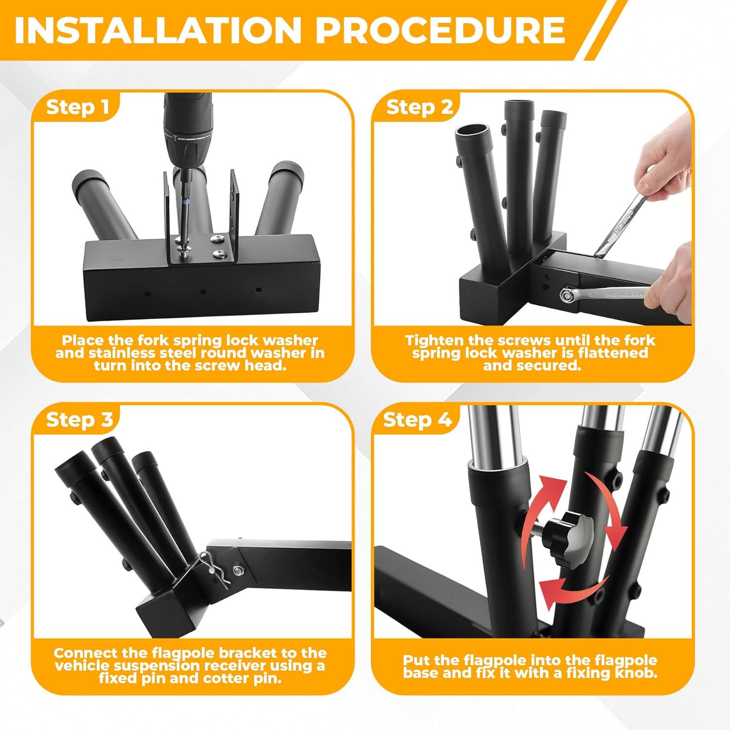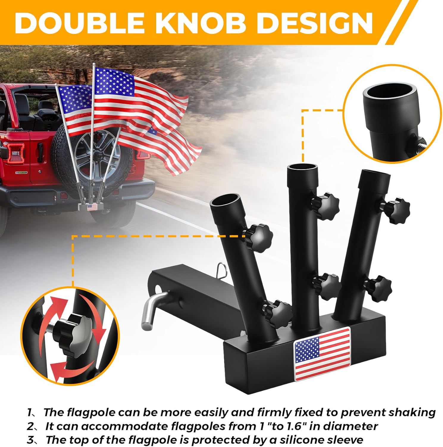 - Double Lock Security - Each flagpole of the trailer hitch flag pole holder is equipped with two heavy-duty knobs to lock the flag firmly, thereby improving stability and safety while driving. Quick adjustment screws, installation without tools, easy and convenient.