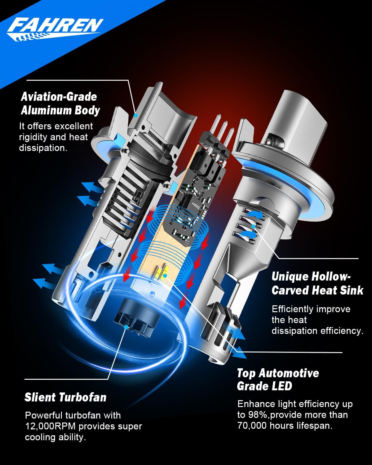 - 【Extended Operational Lifespan - 70,000+ Hours】Engineered with aerospace-grade aluminum utilizing a hollow-core architecture, these 9008/H13 bulbs integrate a turbocharged cooling fan to prevent thermal overload, ensuring consistent performance. The age- polymer seal delivers IP68-rated waterproof and dustproof protection, extending your 9008 lights' durability to over 70,000 hours.