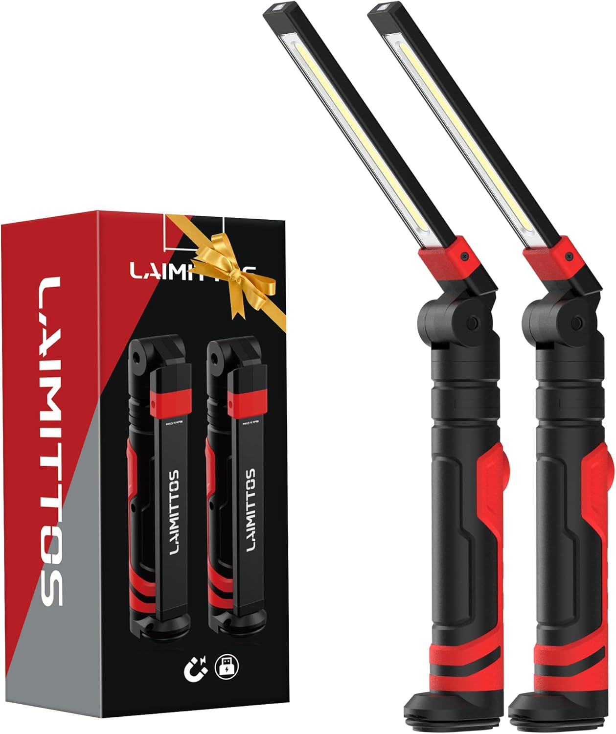 Rechargeable Work Light 2500mAh Magnetic LED Work Light Flashlight Mechanic Light Tool Gifts for Men Him, Foldable Lamp with Hook for Car Repair Emergency BBQ Grill (2 Pack)