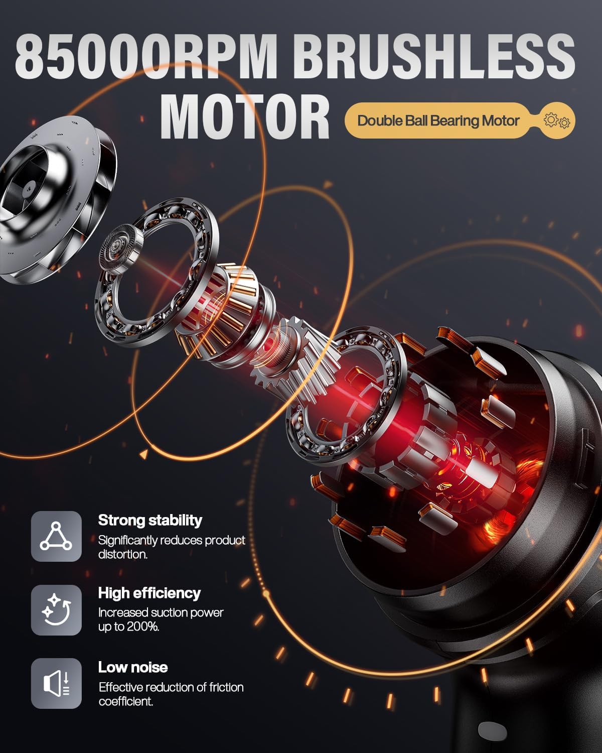 - 【21000Pa Powerful Suction】Equipped with dual ball bearing high-speed motor, this handheld vacuum delivers such strong suction that it sticks to surfaces, effortlessly removing hair, corner dust, food crumbs, cigarette ashes, foot dirt, and cat litter in one go
