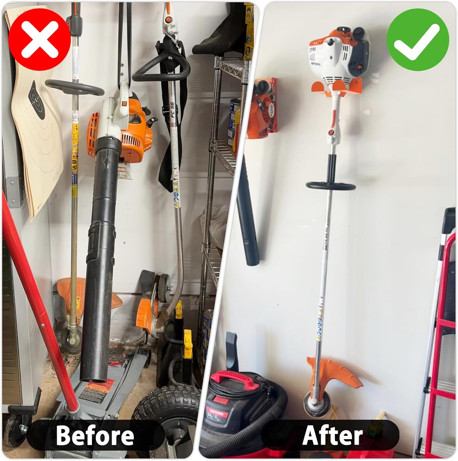 - 【 Space Saving】Our Weedeater Hanger holds your trimmer securely, keeps it off the ground for easy access, allows you to free up valuable space in your garage, shed, home, or enclosed trailers, and is free to place your tools where you like
