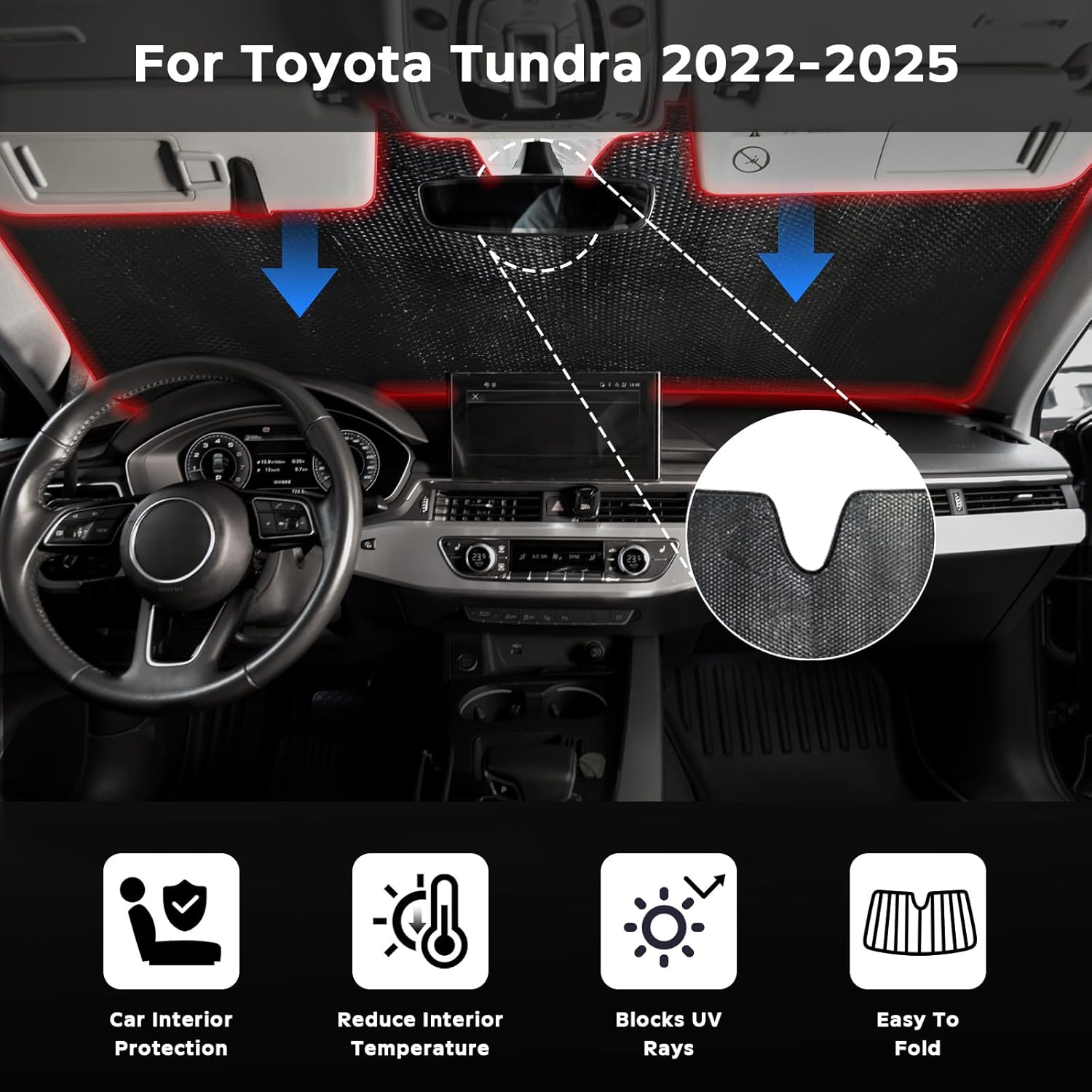 - Precise Fit: This sunshade designed specifically for the Toyota Tundra 2022-2025 front windshield. Blocks 99% of infrared radiation; reduces interior temperature. Protects dashboard/leather from radiation and high temperatures, preventing cracking