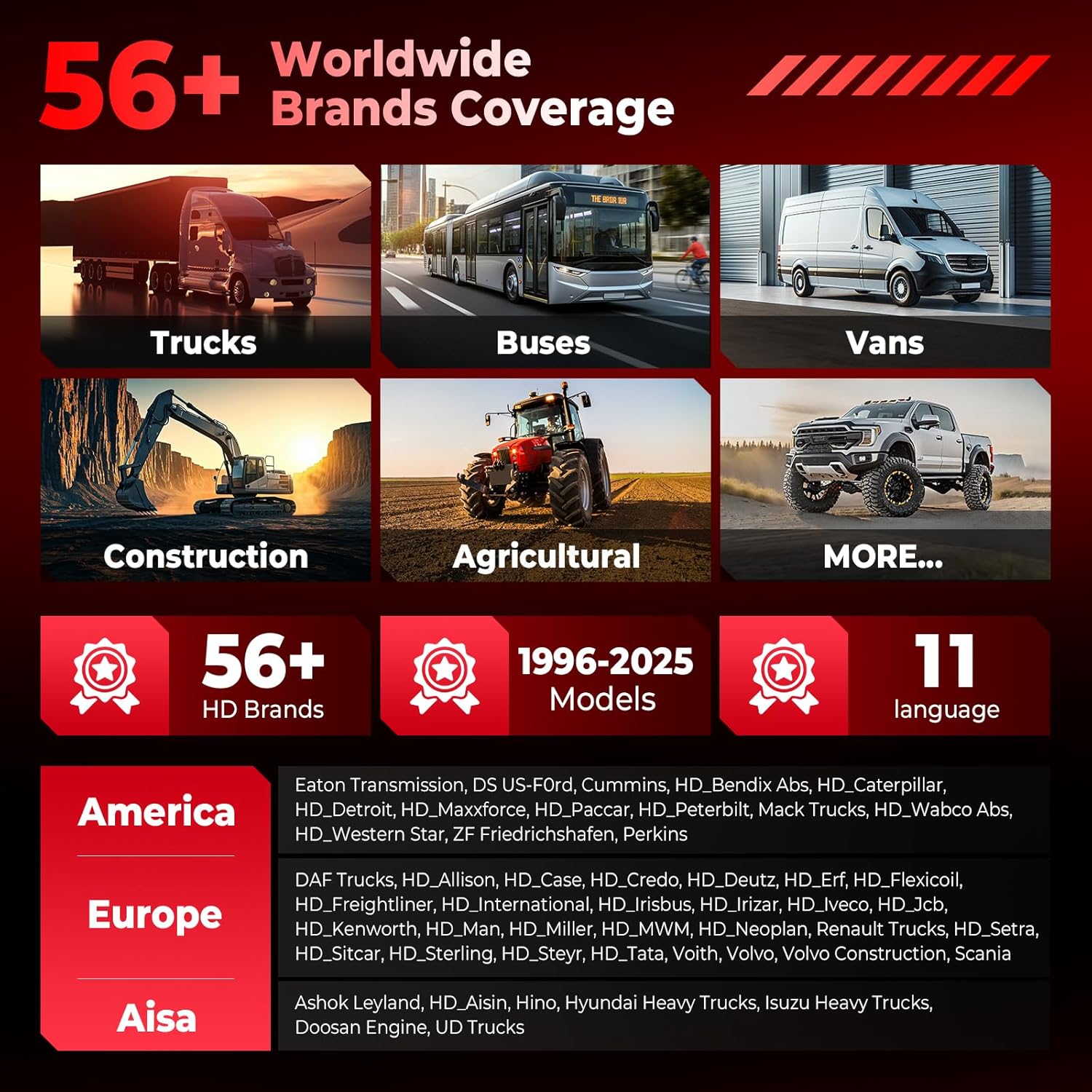 - 【Wide Vehicle Range of Compatibility】Supports OBD2/CAN, J1939, J1587, and J1708 protocols for Class 3–8 trucks (33,000+ lbs), heavy-duty vehicles, buses, vans, construction/agricultural equipment (1996–2024 models); compatible with 56+ global brands including Cummins, Detroit, Caterpillar, Volvo, Freightliner, Paccar, Peterbilt, MAN, Scania, DAF, Isuzu, Hino, and John Deere, covering 10,000+ commercial models. Ideal for diesel trucks, semi-trucks, pickups, and machinery across brands like Aisin, Allison, Mercedes-Benz, Ford Diesel, and Case; no regional restrictions for worldwide use.