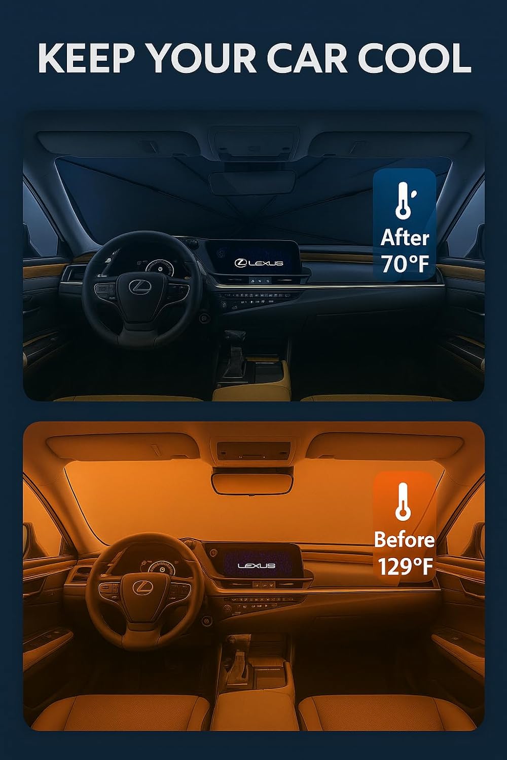 - Certified Sustainable. Customized Windshield Sunshade: Specially designed for the 2019-2025 Lexus ES with precise mirror cutouts, providing 100% shading, carbon fiber handle, ensuring lightweight and durability while also having a fashionable feel. Our ES windshield sunshade can protect the interior of your car from various light damage and prevent dashboard and seat degradation.
