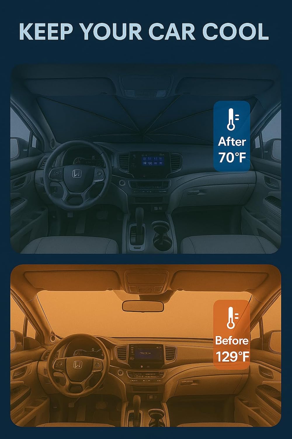 - Innovative Ice Crystal Material: The sunshade adopts a 4-layer design, which is thick enough to effectively block and reflect sunlight. After multiple uses, it is still strong and not easy to tear. The sunshade also uses innovative ice crystal materials to evenly distribute heat, quickly cool down, and keep your car cool all the time. You no longer have to worry about getting your seat or car handle scalded by high temperatures.