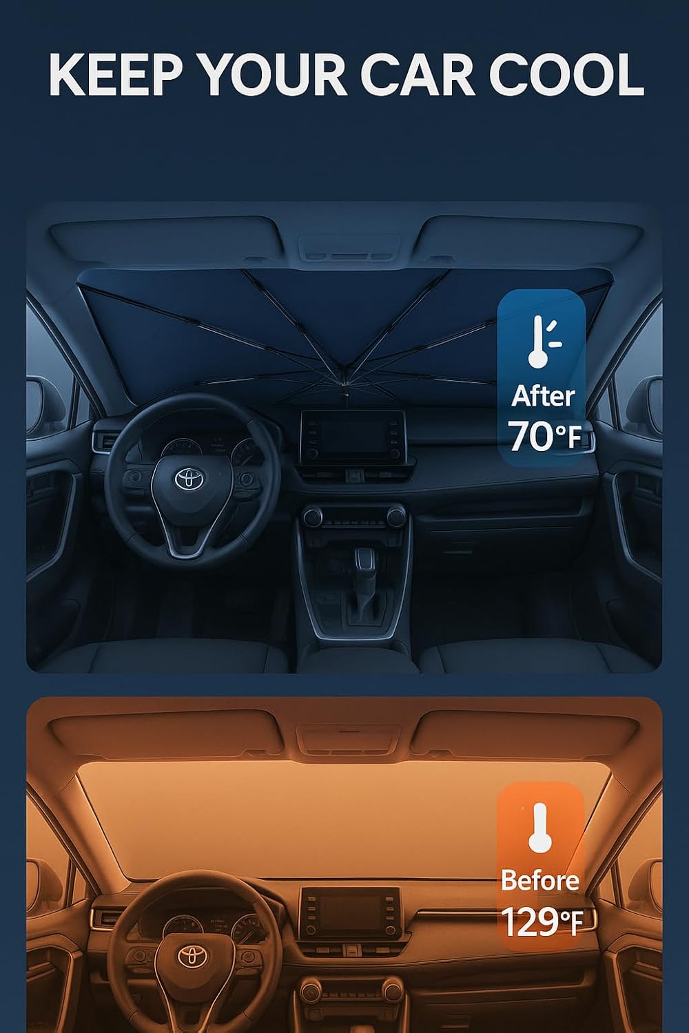 Proadsy Windshield Sun Shade Umbrella for Toyota RAV4 2019-2025 2026 Foldable Car Umbrella Sunshade with Soft TPU Handle Spring Structure Crystal Cooling Material Protect Car from Rays & Heat