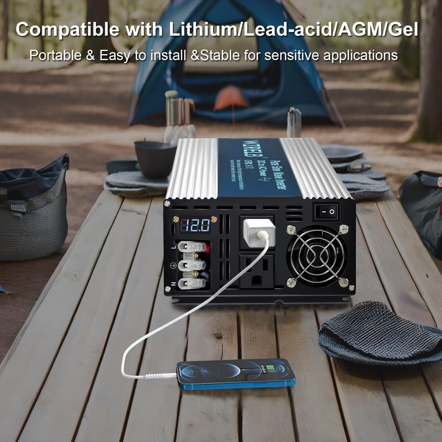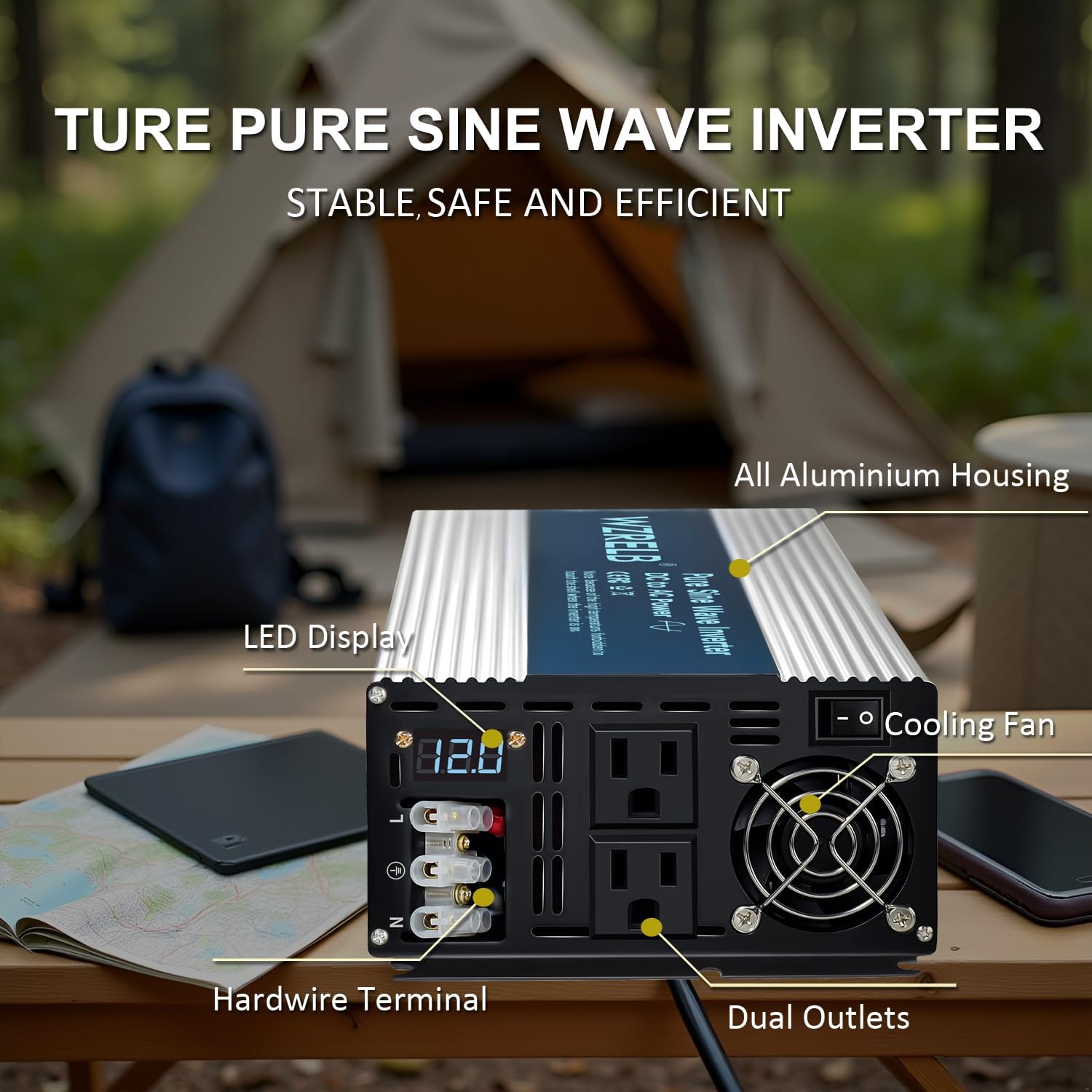 WZRELB 3500W Pure Sine Wave Inverter, Car Power Inverter 12V DC to 110V 120V AC Converter for RV, Truck, Solar, Outdoor with Dual AC Outlets, Hardwire Port, Surge 7000W, LED Display,Off-Grid