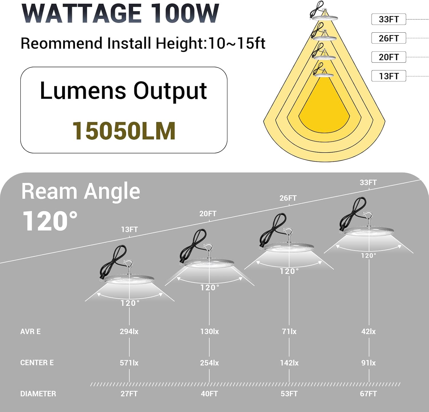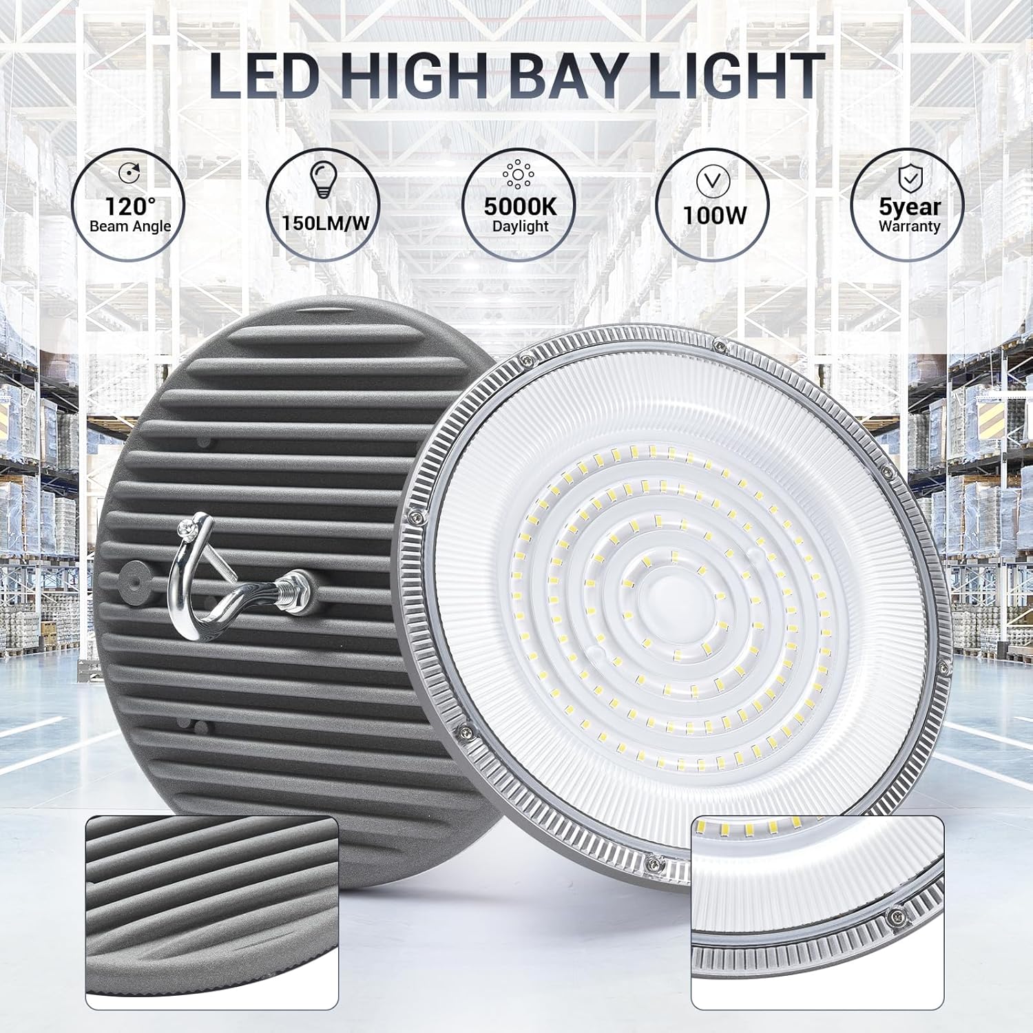 - 【Super Bright】Our 100 watt UFO LED high bay light features 15,050 output lumens, which provide super bright light equivalent to 450W MH/HPS and save your electric charge up to 83%. It uses 120PCS high quality SMD3030 LED chips with higher CRI and produces clearer, more color-friendly light to reduce eye strain.