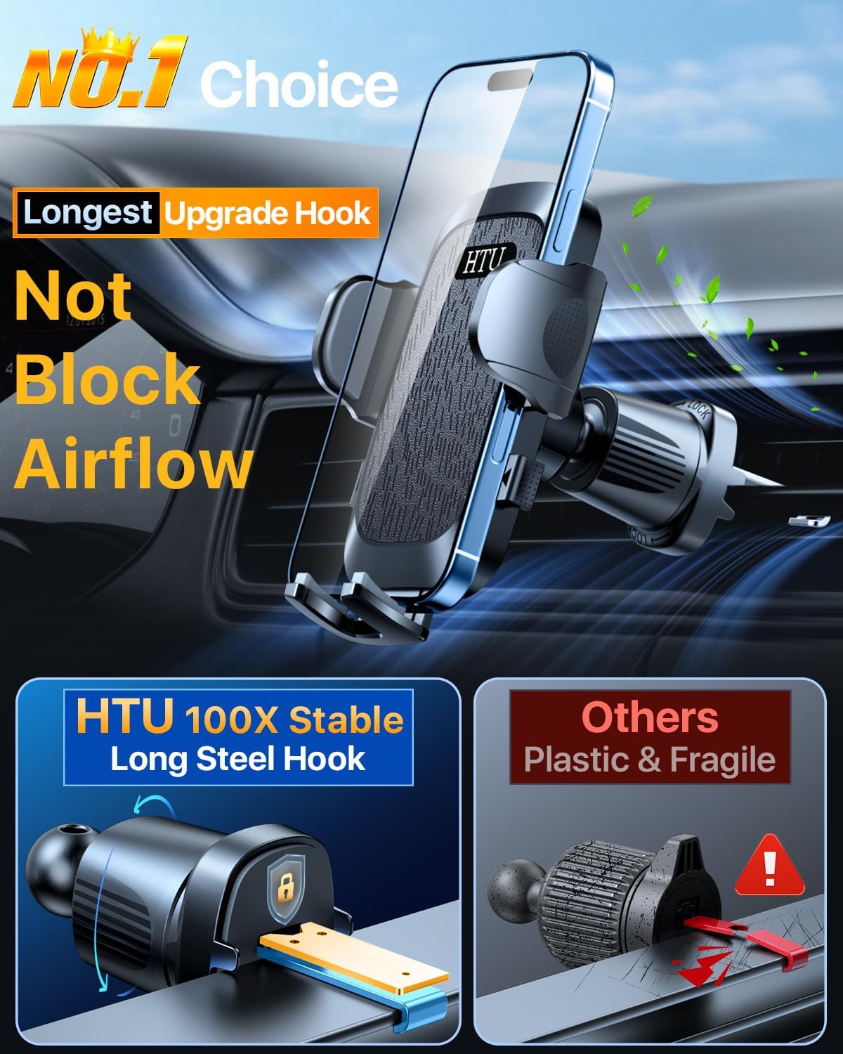- [Tangle-Free Cable Management] The HTU dashboard phone holder is also equipped with a cable holder. The holder holds your smartphone's charging cable, helping to ensure the cable stays connected and entangled-free. What's more, the cable clip also acts as a support stabilizer for the phone holder rod, which can prevent the phone from shaking and enhance stability.