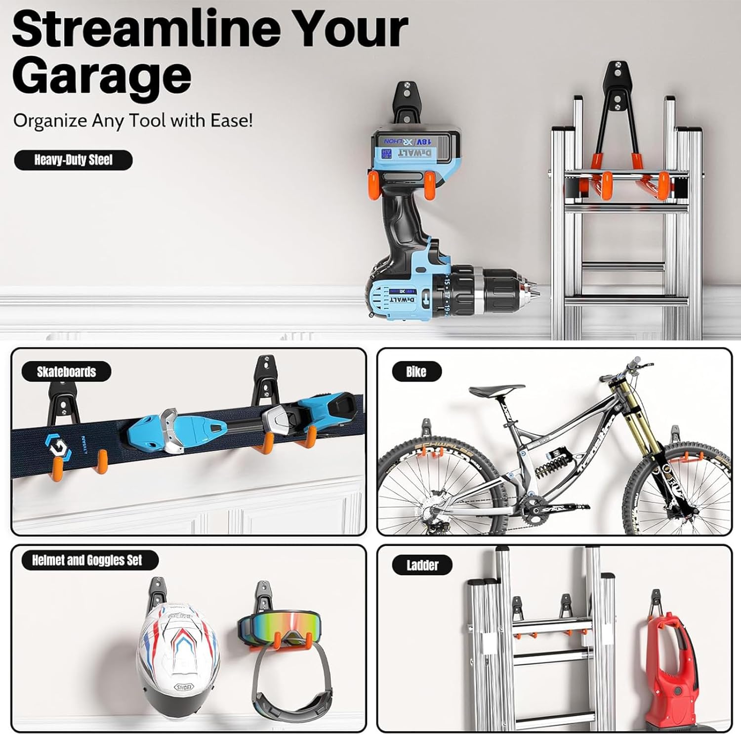 - WEATHERPROOF& DURABLE- Rain or shine, this garage storage hooks stands strong! Its surface is treated with a special spray and dip coating process, ensuring it's waterproof, slip-proof, scratch-resistant, and built to withstand whatever nature throws its way