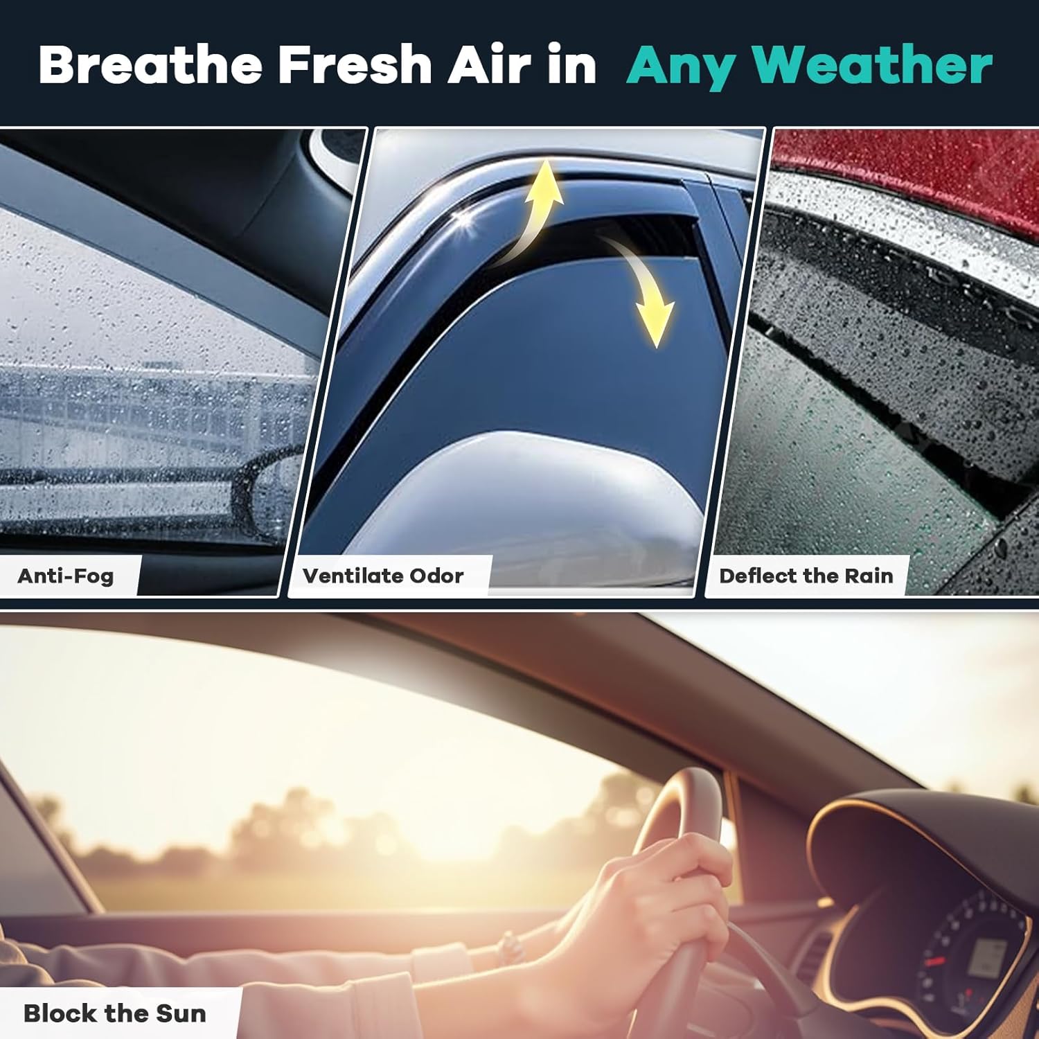 - ăImproved Ventilation and Air FlowăAllows fresh air to circulate through open windows while keeping the rain out or reduces heat. Reduce mirror and window fogging; reduce sun glare through side window. Dark Smoke translucent color will not obstruct the driver's view while driving
