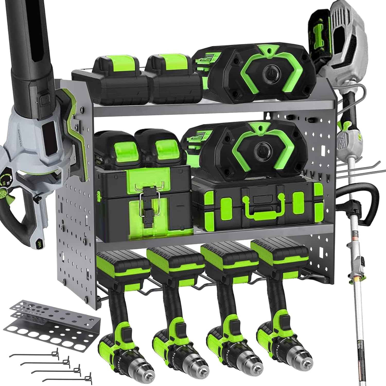 Wall Mount for EGO-Compatible Tools – 3-Layer Adjustable Garage Organizer 200lbs – Heavy Duty Hanger for Leaf Blower, Trimmer, Weed Eater (grey)