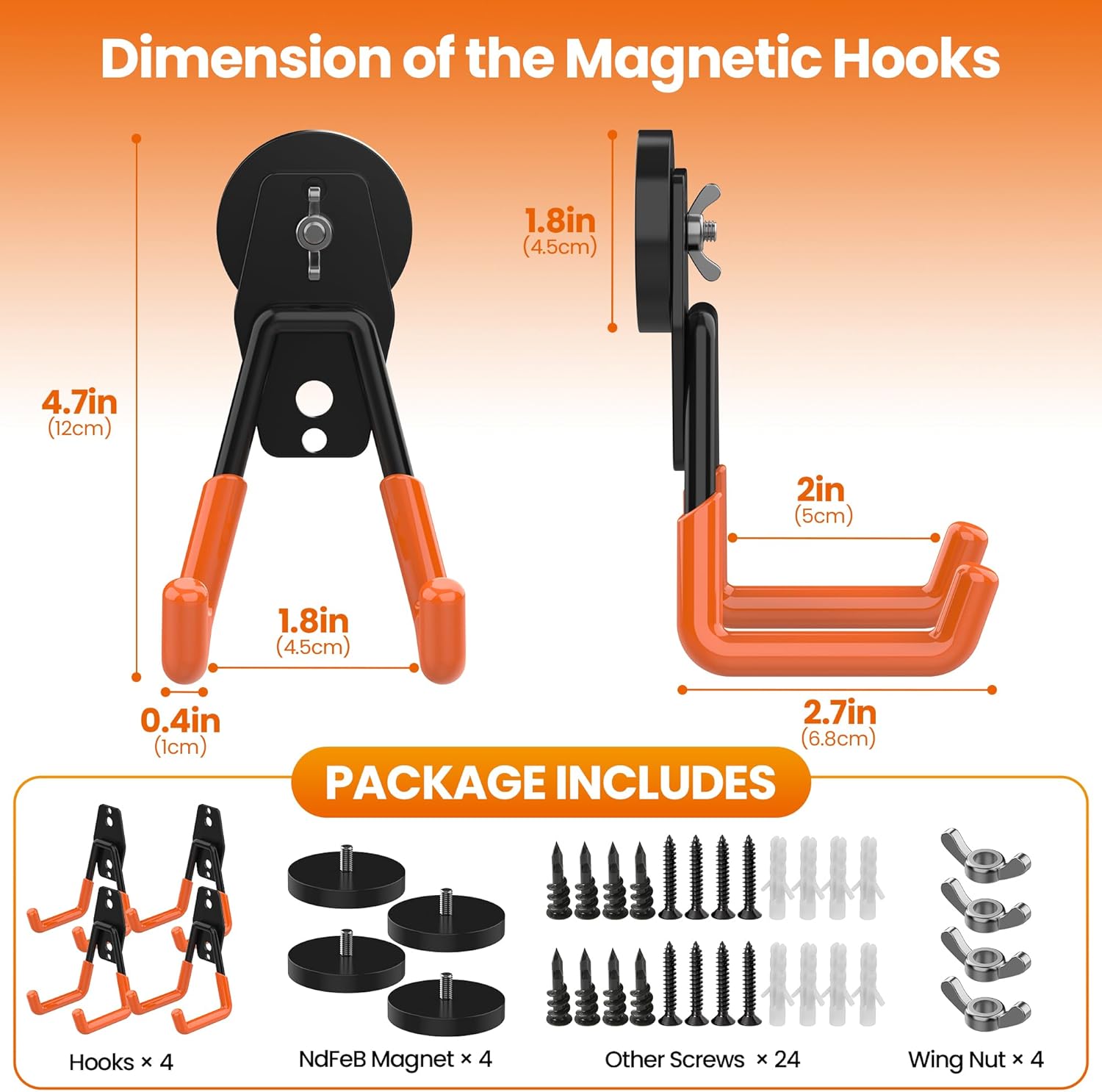 - 【Super Strong Magnetism & Sturdy Structure】 Each magnet hooks heavy duty features magnet base embedded with 6 industrial-grade rare earth neodymium magnets, ensuring powerful adsorption and reliable load-bearing. Made of thick, high-quality steel, these magnetic tool hooks provide a stable hold for heavy tools like power drills, hammer, air tools, shovels, rakes, ladders, toolboxes, toolchests, wrenches, tool carts, as well as daily items such as brooms, mops, dustpans, hoses, gym bags, backpacks, kitchen utensils, dog leashes, wires, straps, ropes, extension cords, clothes, and wreaths