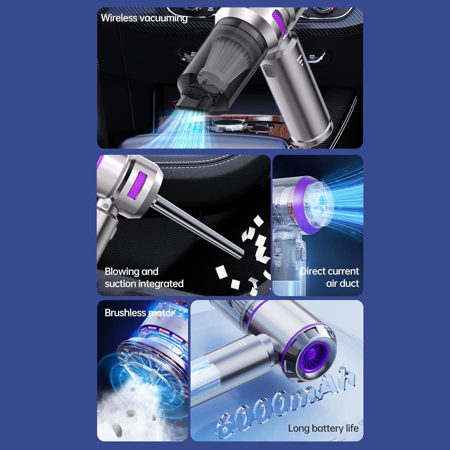 - ă16000PA Car Vacuum Cleaneră This car vacuum cleaner is equipped with an upgraded 110W powerful and high-speed brushless motor and advanced noise reduction technology, providing powerful performance and reducing the noise to less than 70 decibels. The 3 adjustable suction power modes of 6000PA, 12000PA and 16000PA, with a powerful 16000PA suction power, this small handheld vacuum cleaner allows you to clean pet hair, crumbs, dust and sand hidden in the car seat or sofa.