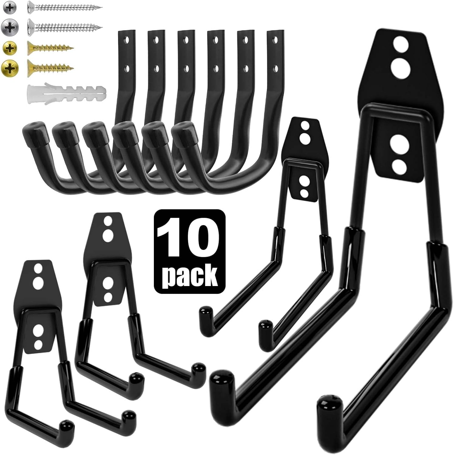 - DUAL HOOK COMBO: Includes 4 double hooks (2.8" and 5.1") and 6 J-style hooks (3.5"), offering multiple configurations to suit various storage needs. Whether large or small tools, everything hangs within easy reach, ideal as wall hooks for hanging bike, shovels, backpacks, brooms, rakes, scooters, weed eaters, hoses, strollers, blowers and heavy duty coat.