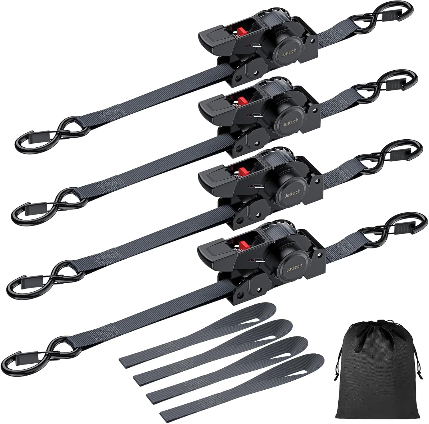 Justech 4 Pack Retractable Ratchet Straps, 1 in x 11.6 ft-1411 lbs Break Strength, Heavy Duty Auto Ratchet Tie Down Straps with Soft Loops & Storage Bag for Motorcycle, Truck, Trailer, Cargo Van, Boat