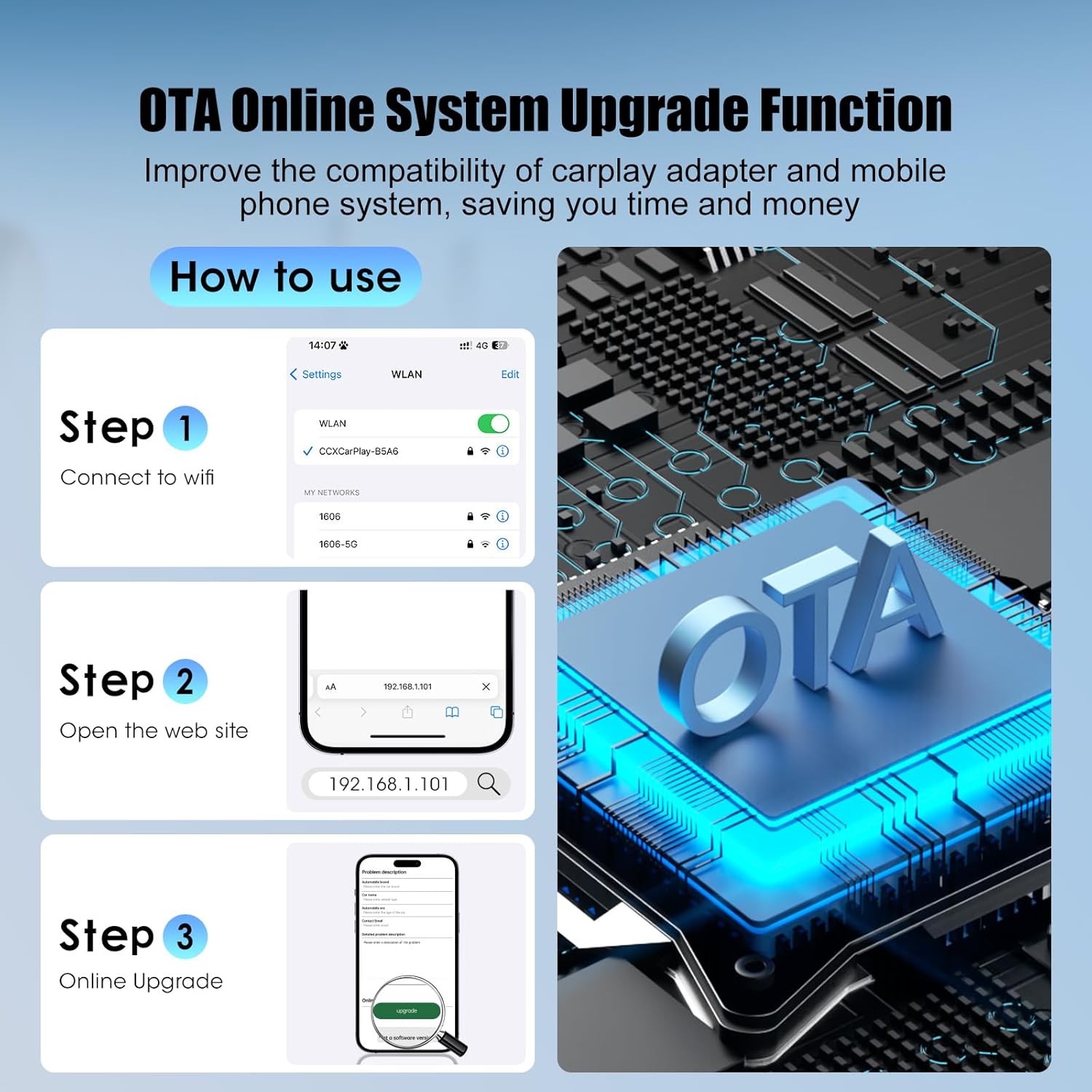 - ăMultiple Control ItemsăThe apple car play wireless adapter retains the four original controls of the car voice assistant, steering wheel, touch screen, and central control button, making your operation safer and more convenient during driving. Also,the wireless carplay adapter supports OTA upgrades to improve the compatibility of the IOS system and wireless carplay, and can be quickly upgraded separately without additional costs