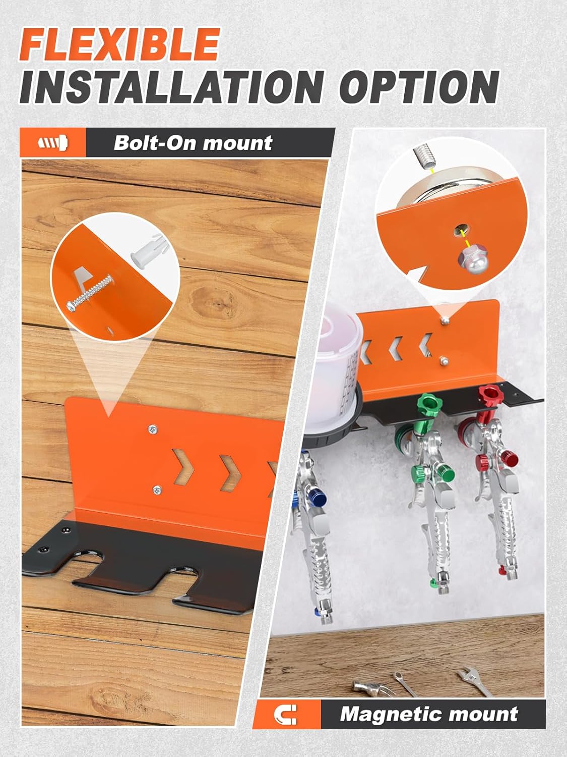 - Organized Tool Storage: Stores up to 7 gravity feed spray guns without cups, or 4 with cups. The open design keeps your tools visible, accessible, and neatly lined up—making every paint job smoother from start to finish