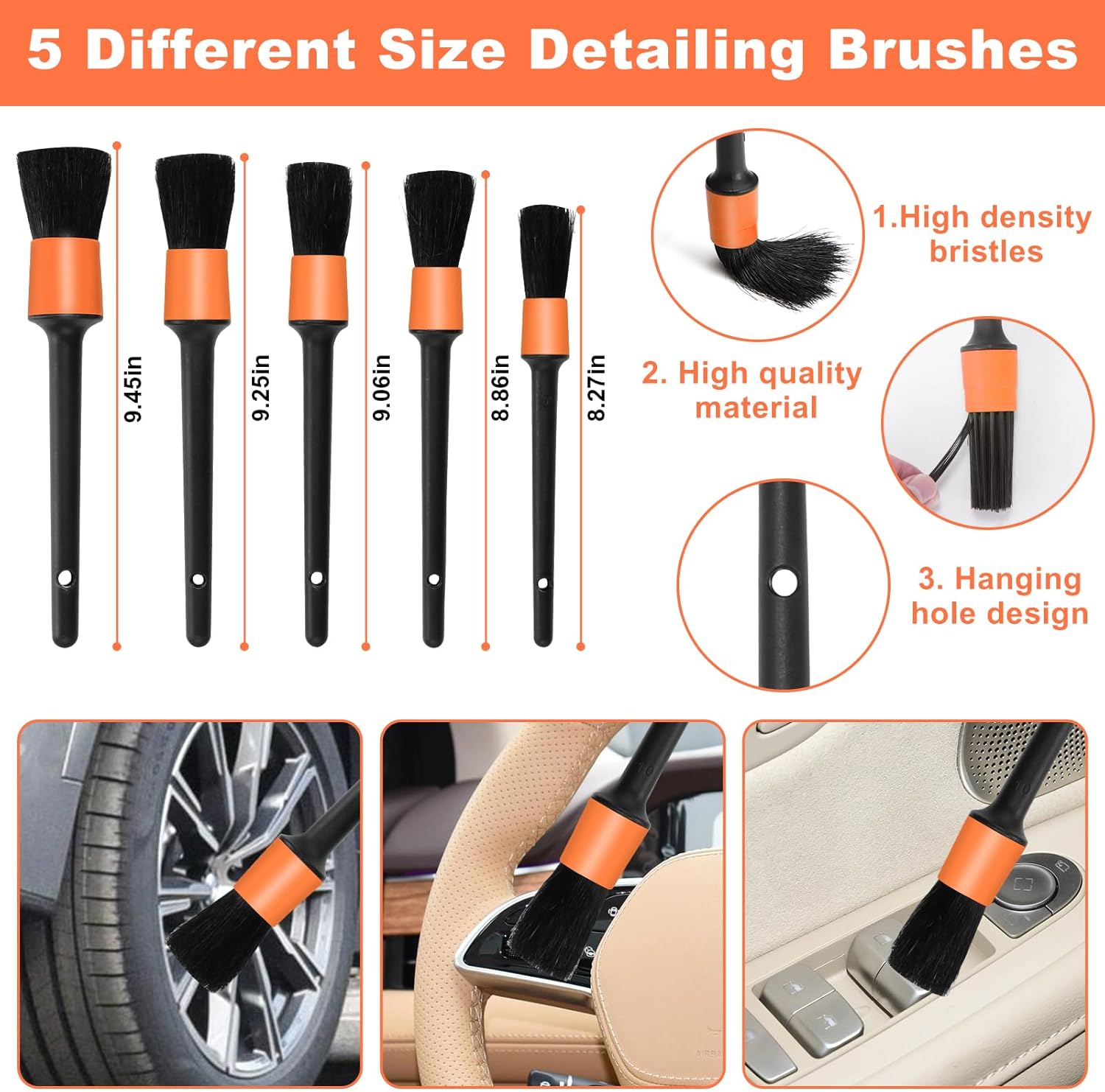 - Professional Brush Kit: 5 precision-sized detailing brushes tackle every surface - small brush cleans crevices/lug nuts, medium brush handles seats/dashboards, large brush efficiently scrubs wheels/engine bays. Complete with special vent and dash dusting tools