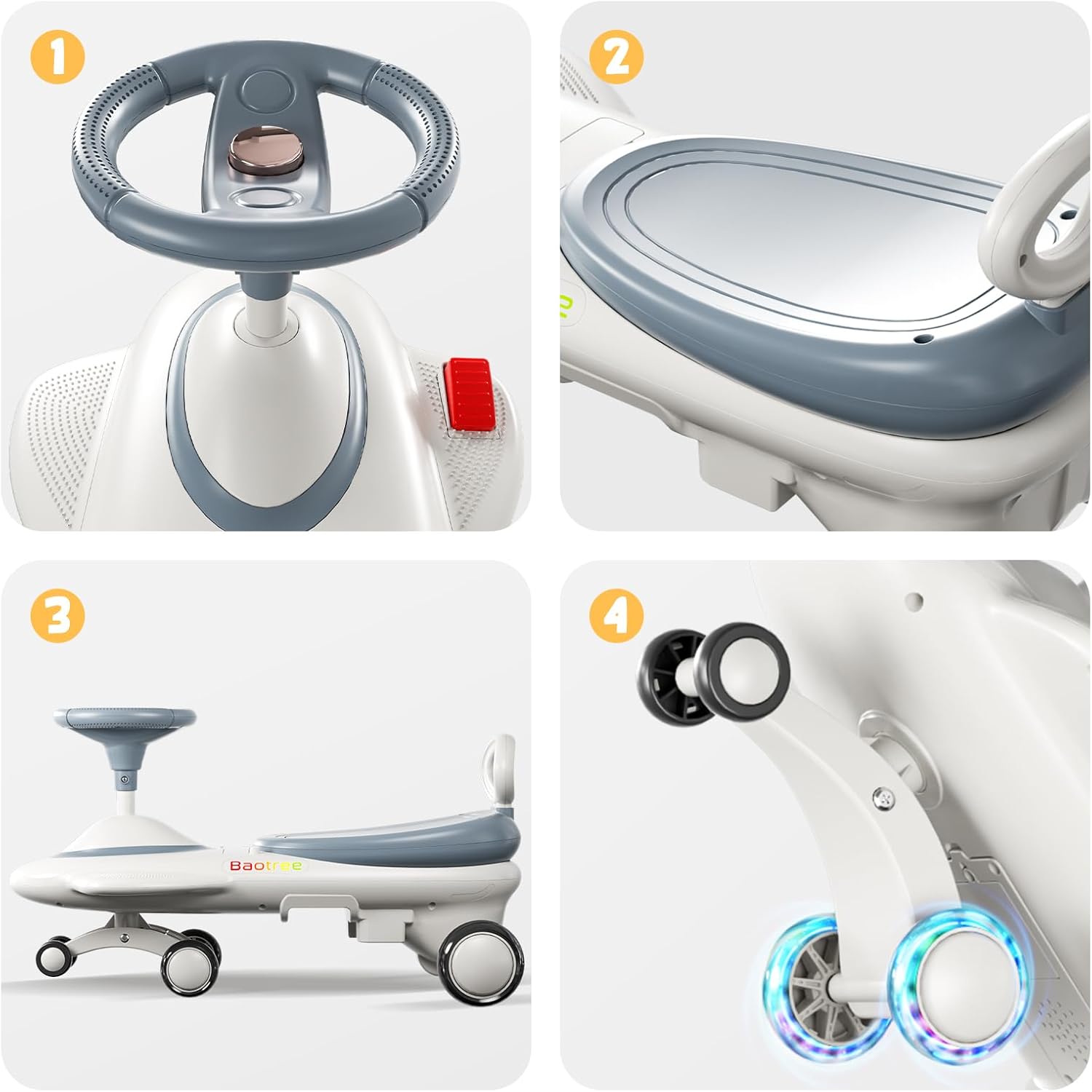 - 🎵 4D interactive entertainment system Exclusively configured with engine roar sound effects + 7-color gradient LED atmosphere lights, the steering wheel has a built-in Bluetooth speaker that can connect to the phone to play nursery rhymes/stories, and stimulate children's role-playing creativity.