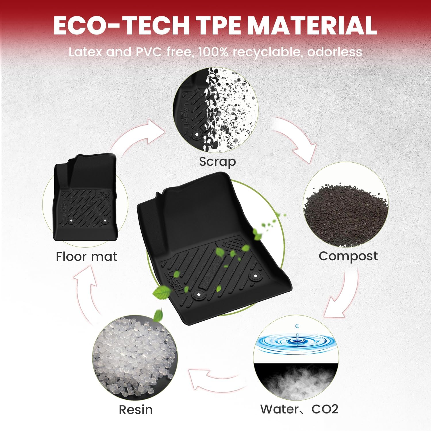 - ăDurable & Safe MaterialăLASFIT all weather floor mats for Cruze use elastic TPE (Thermoplastic Elastomer), no foul odor is produced even at high temperatures, soft touch and exquisite finish. The LASFIT floor mats for cars are skid-proof and recyclable.