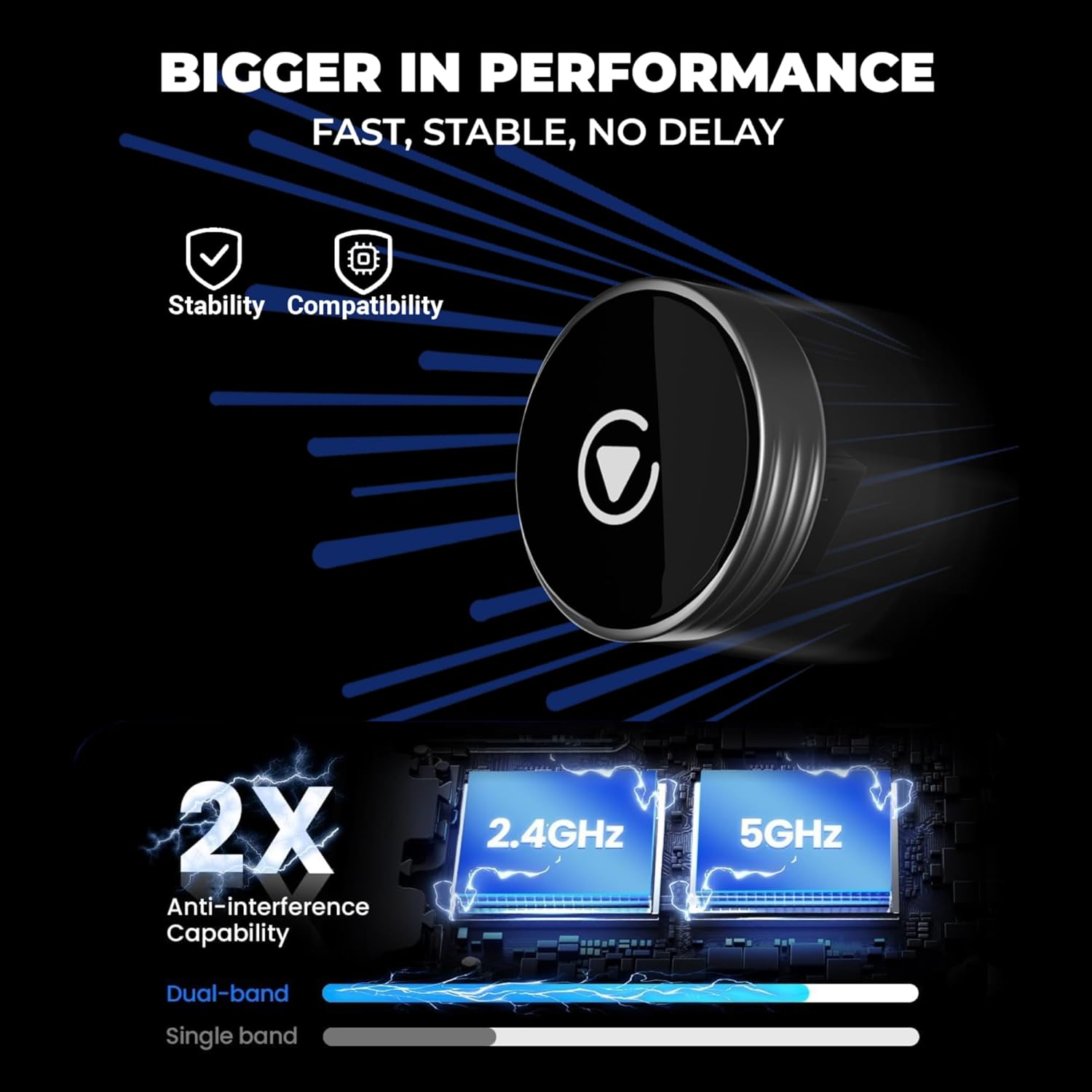 - ๐ Dual-Band Super Performance โ Featuring a 2.4GHz + 5GHz dual-band chipset and upgraded 8-core processor for 100% improved performance, our adapter ensures enhanced stability and near-zero latency. Experience lightning-fast, smooth Wireless CarPlay performance for seamless music streaming, navigation, voice assistance and hands-free calls.