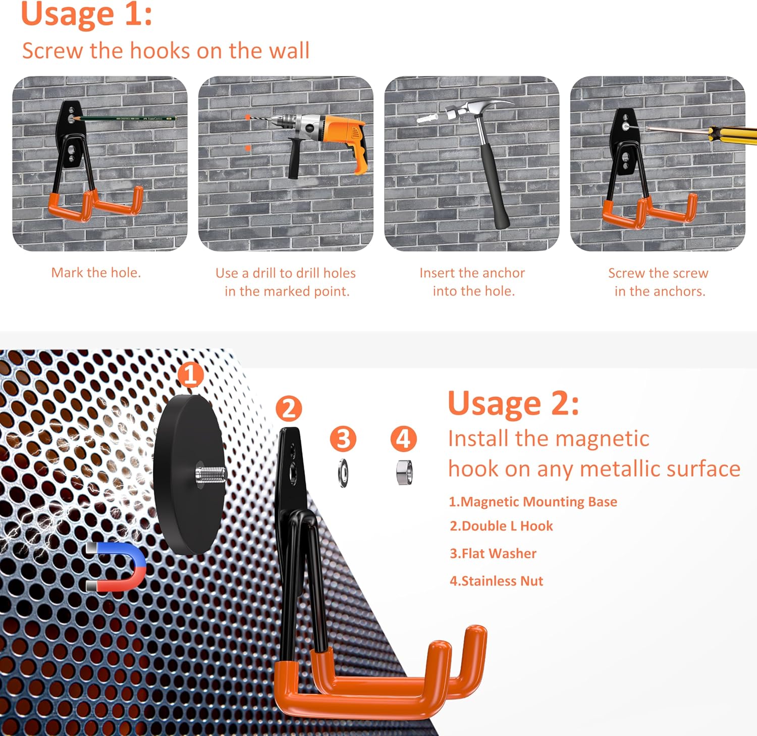 - Widely used storage hooks: Designed to meet your needs in the garage, they securely hang most objects, including a power drill, a variety of garage and garden tools, shovels, brooms, mops, and tool boxes