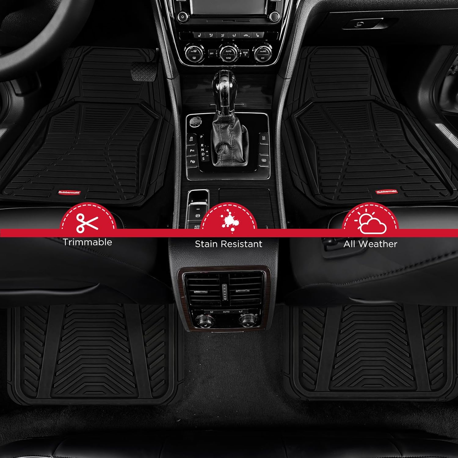 - Customizable Universal Fit:Rubbermaid floor mats are engineered for versatility with trim lines that let you easily customize each piece to match the exact contours of your vehicle’s floor using only household scissors. Designed for cars, SUVs, pickup trucks, and vans, this 4-piece full set includes 2 front mats (27" x 19") and 2 rear mats (17" x 14") to ensure comprehensive interior protection with a tailored fit.