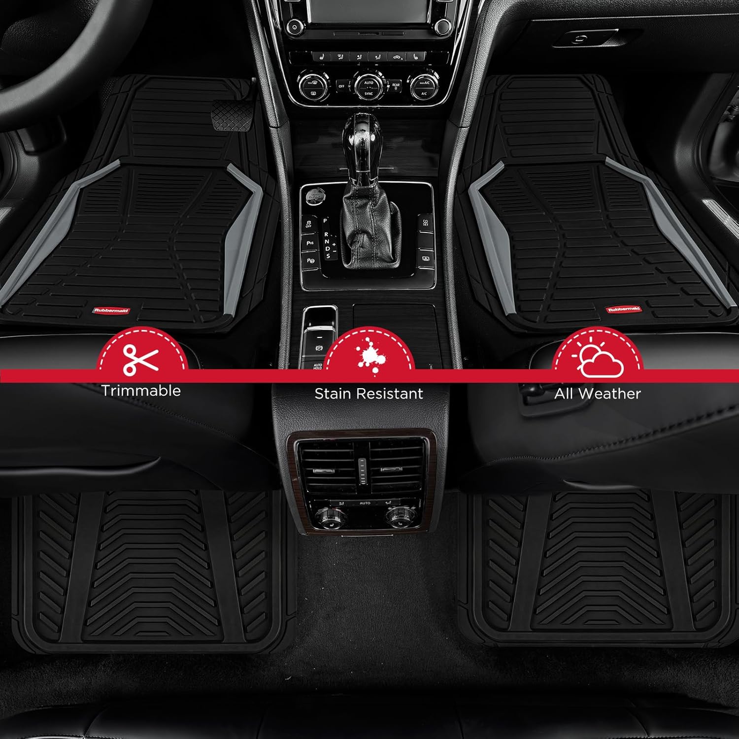 - Customizable Universal Fit:Rubbermaid floor mats are engineered for versatility with trim lines that let you easily customize each piece to match the exact contours of your vehicle’s floor using only household scissors. Designed for cars, SUVs, pickup trucks, and vans, this 4-piece full set includes 2 front mats (27" x 19") and 2 rear mats (17" x 14") to ensure comprehensive interior protection with a tailored fit.