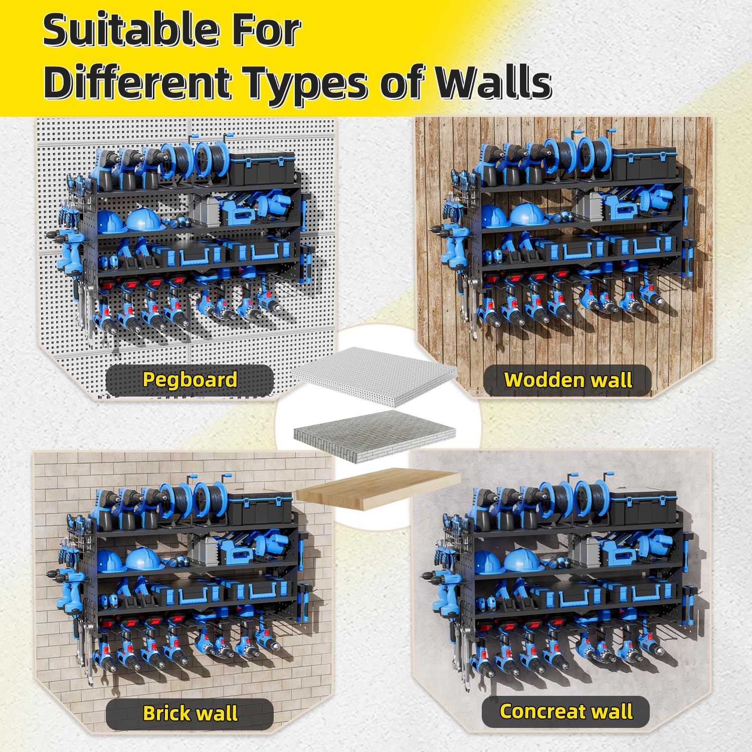 - 💪420-600 LB Load Capacity & Heavy-Duty Construction : Engineered from industrial-grade steel, our large power tool organizer wall mount boasts an exceptional 420-600 lb load capacity. Confidently store heavy power tool storage of any weight. Rigorous testing ensures stability – no more worries about breakage or falls.
