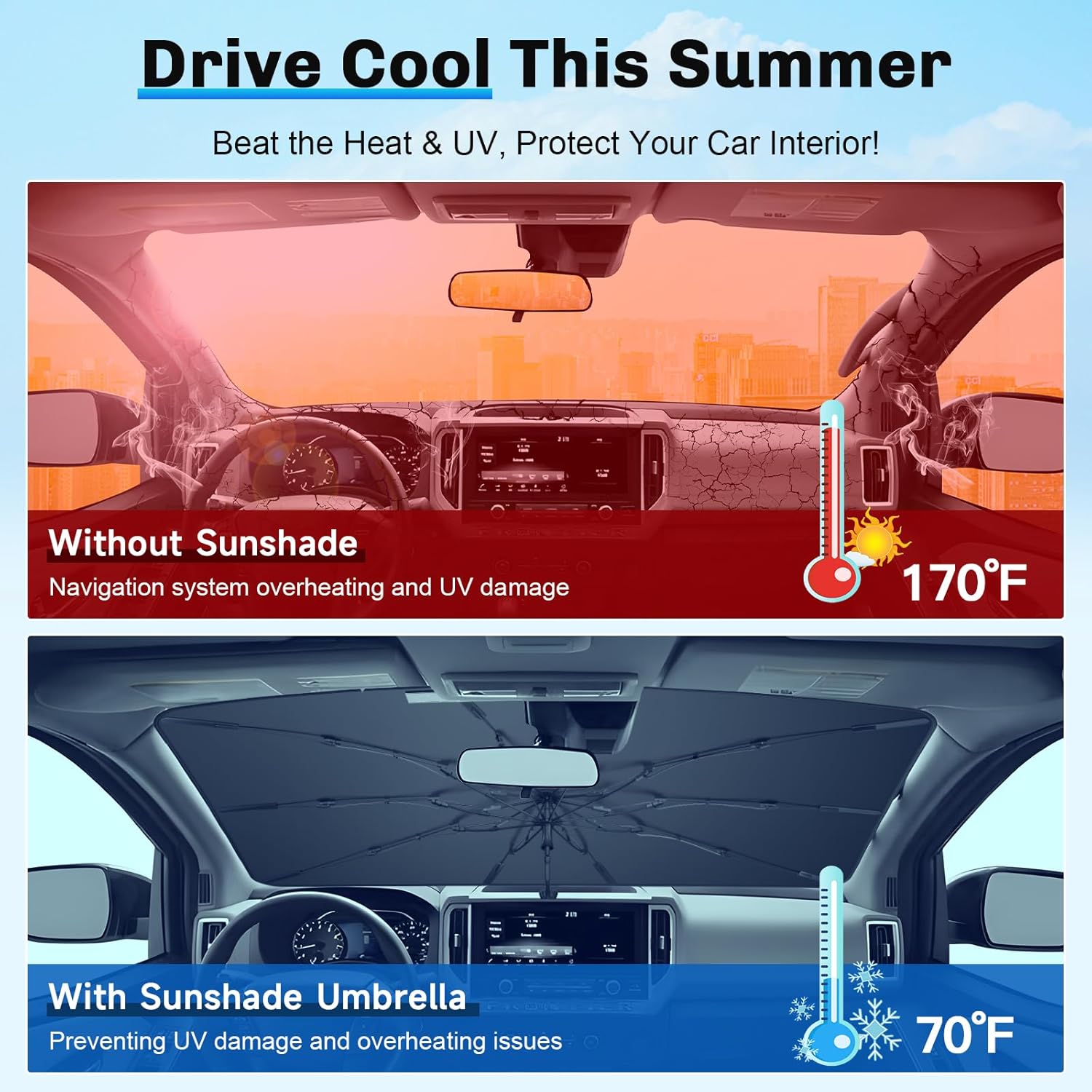 - 3. Enhanced Durability and Stability: Our 2024 2025 Frontier Windshield Umbrella uses 10 glass fiber ribs for high strength, heat resistance, and anti-rust performance. Silicone strips withstand 200ยฐC, ensuring durable shade and interior protection