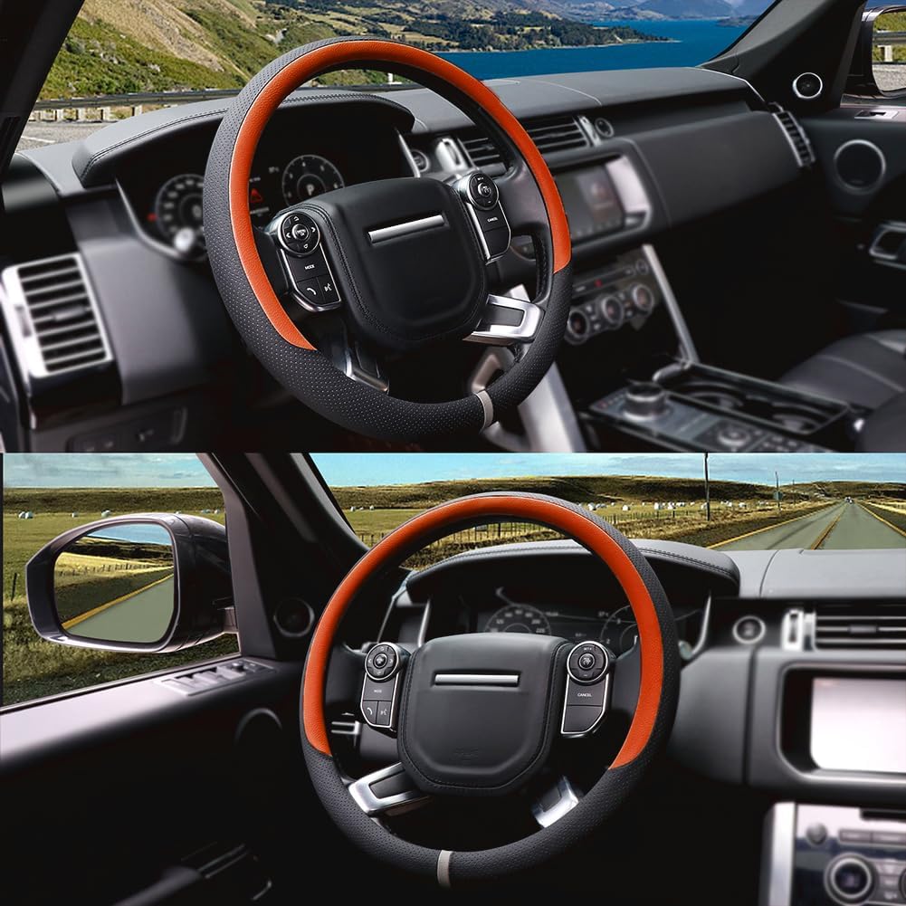 COFIT Breathable Car Steering Wheel Cover 15 inch Auto Universal Leather Wrap Non-Slip Steeringwheel Protector Automotive Interior Accessories, Orange (Suit for 14.5-15 inch)