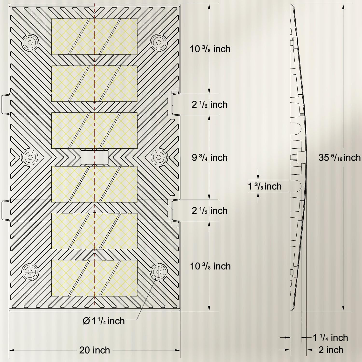 - Middle Sections --- 35" x 20" x 2" inch, the middle section that can be connected, the quantity used can be determined according to the width of the road, 4 middle sections can be connected to form a speed bump that is 80" long, 35" wide, 2" High.