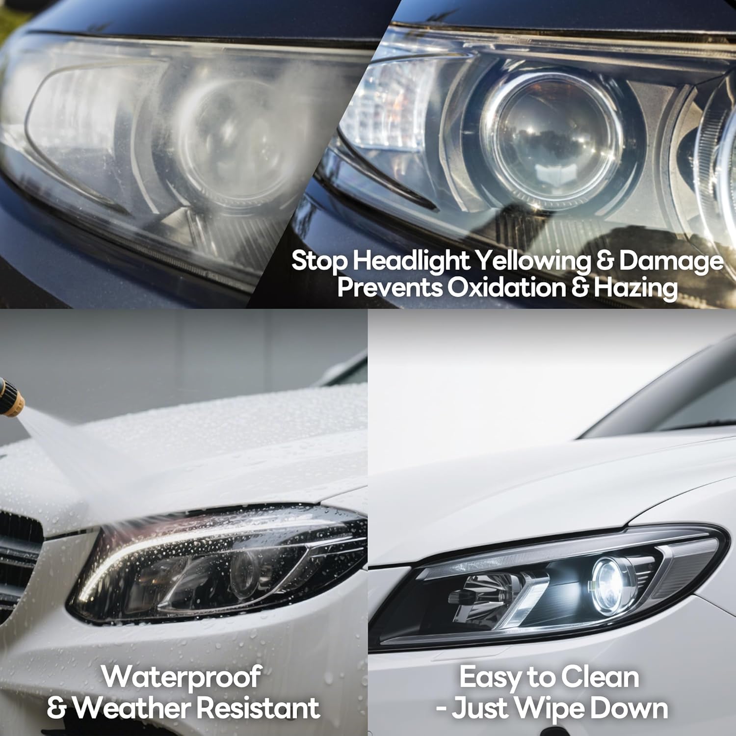 - [Non-Damaging Adhesive] Premium clear adhesive guaranteed not to harm your headlight's factory coating or plastic lens during application or future removal. Dry application leaves no sticky liquids residue behind.