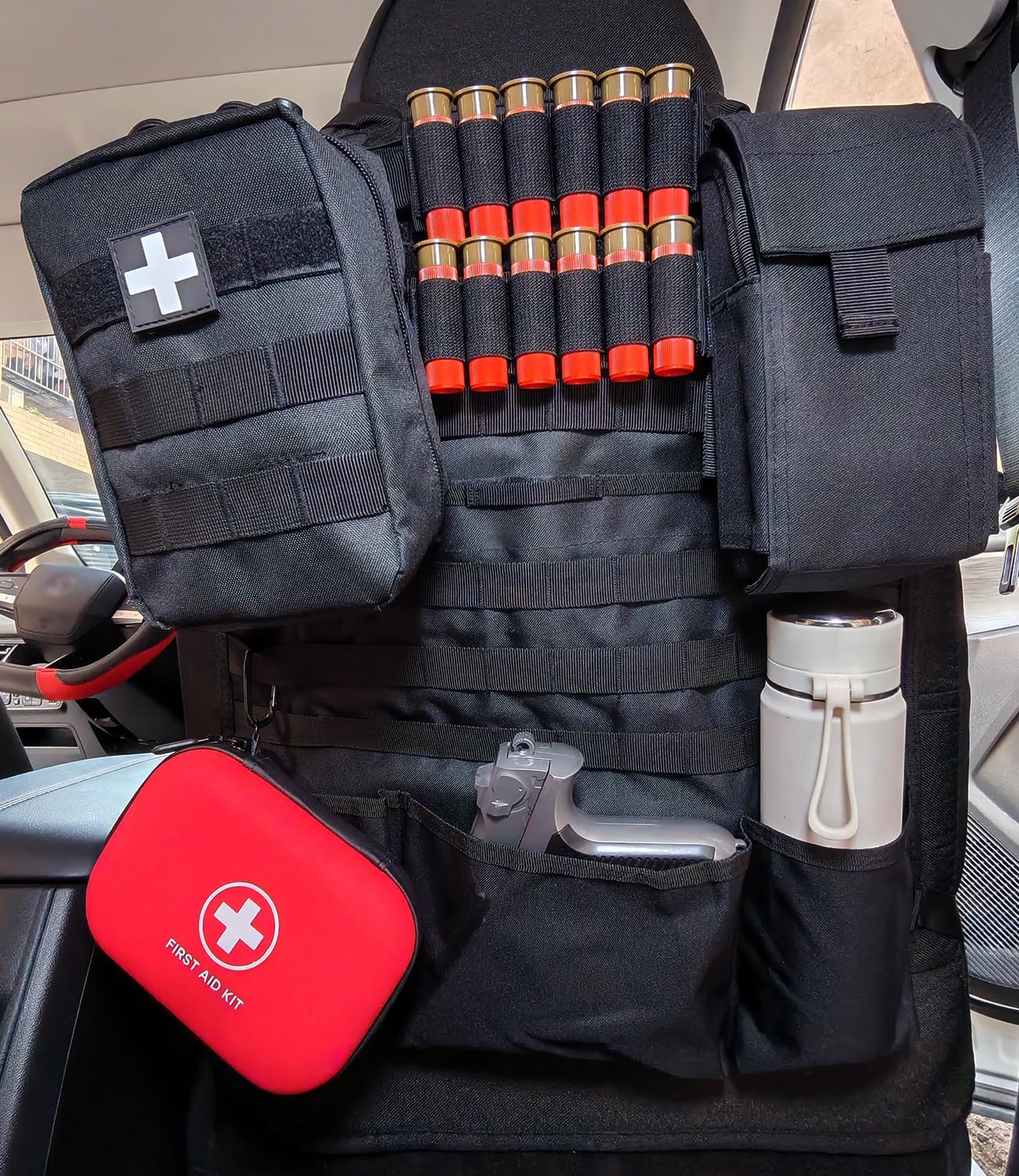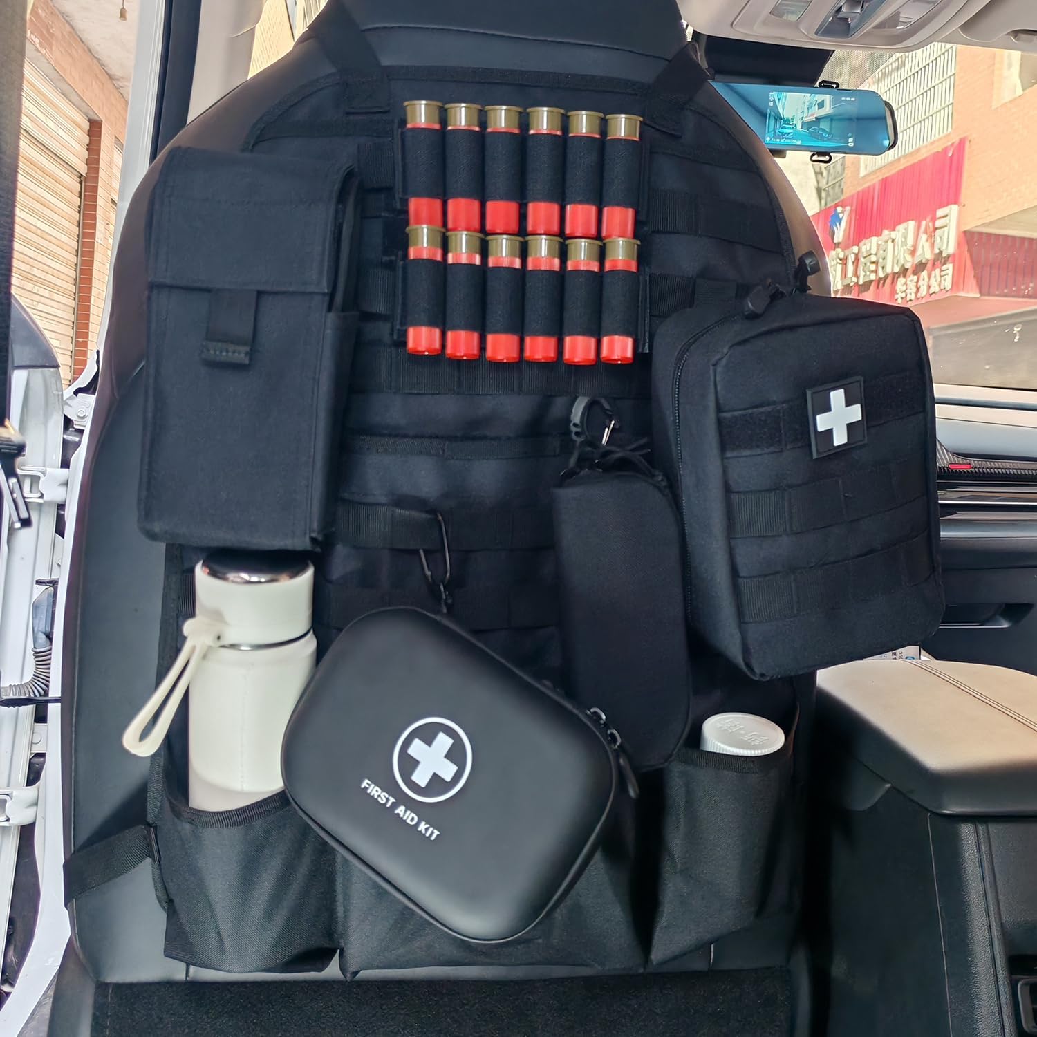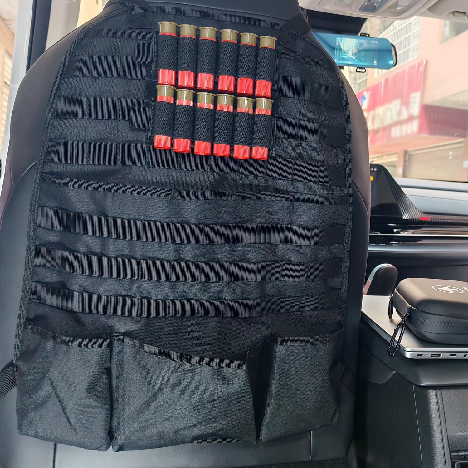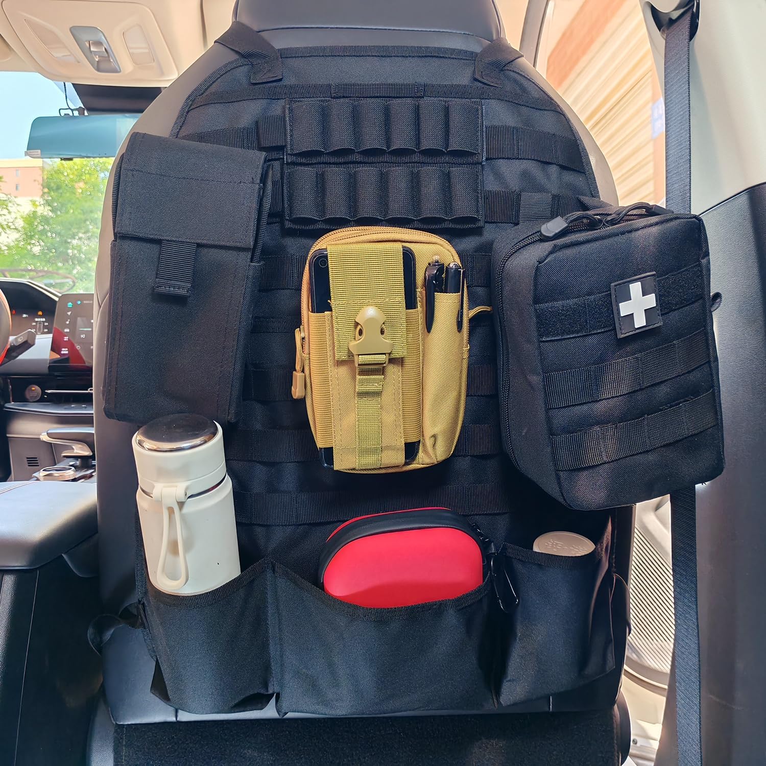 - The car seat organizer has two adjustable straps and a durable buckle, allowing you to adjust and ensure it on your headrest and the bottom of the car seat. It can also be installed and disassembled quickly. Our molle seatback panels have 6 rows of molle panels for adding molle pouches, emergency kits, EMT bags, Tactical eye box, easily to extend your storage space.
