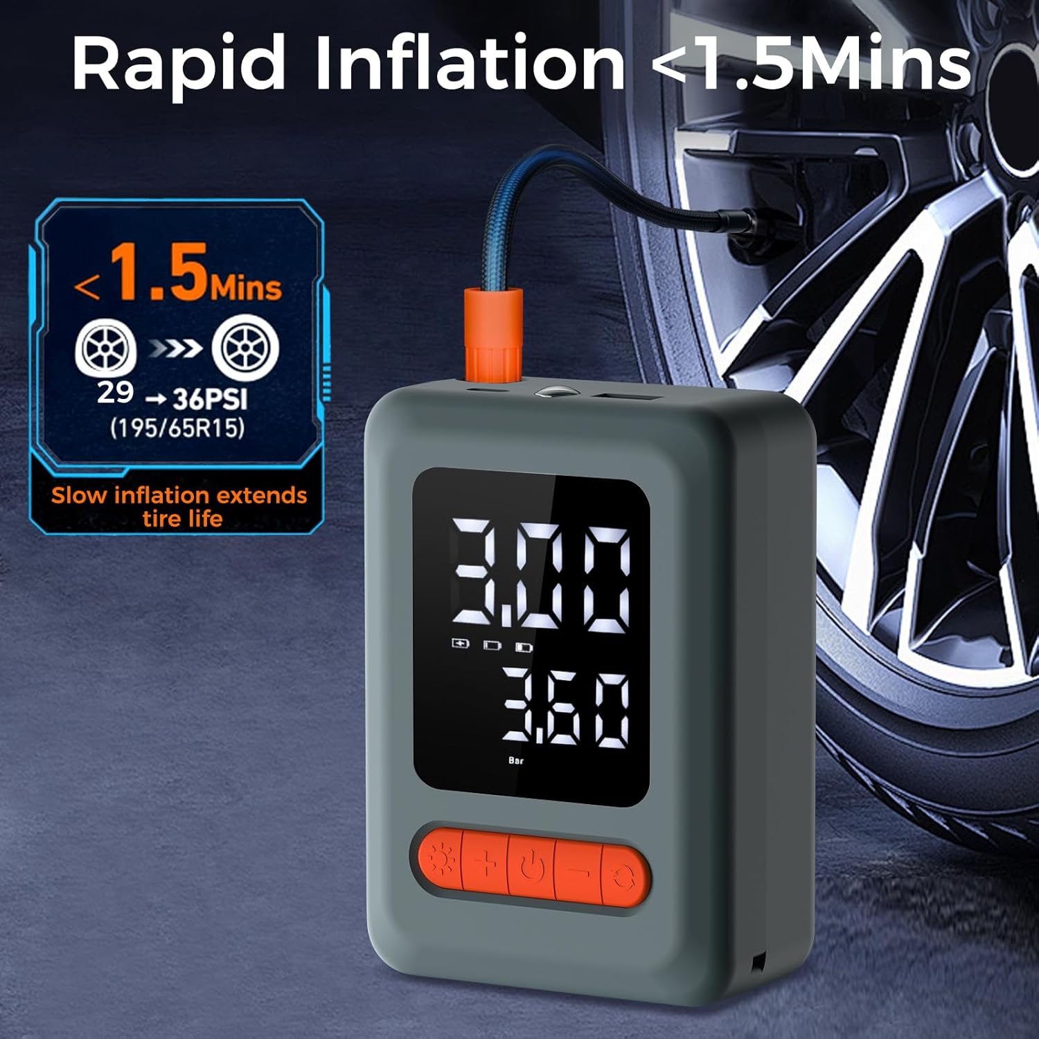 - 【Long Power, Auto Safety】 The 5600mAh battery refills 15 tires (195/65R15, 29→36psi) per charge. Auto-stop with presets enables hands-free inflation, helping reduce over-inflation risks. Verified for motorcycles, bikes, compact cars, and balls in one-touch operation.