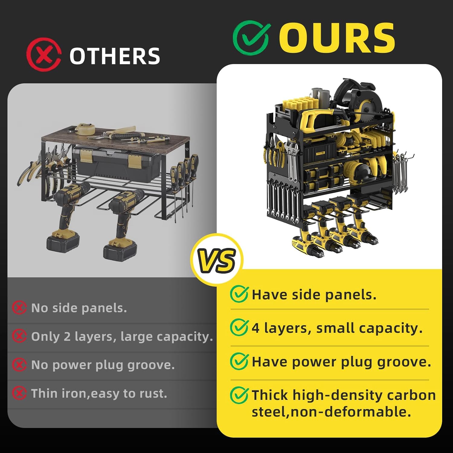 - 🔧【LARGE CAPACITY&SIDE PLATES】This wall-mounted power tool organizer is more storage space than standard tool racks.It has 4-layer high-capacity design and 4 cordless drill holders and 2 side-plates,great for storge electric drills/power drivers/impact wrenches/mpact drills/cutters/angle grinders and other handheld power tools.The 4-layer can hold batteries, saws,wrenches,chargers and other tools, and the side racks can hold wrenches/screwdrivers/hammers/pliers,scissors,etc.
