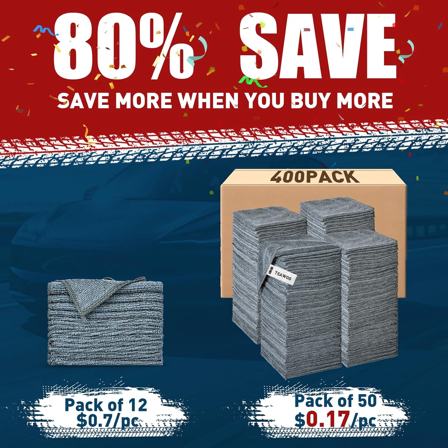 - 【Massive Value Pack】 Whether you need 50 cloths for daily home use or 400 for commercial cleaning (car shops, restaurants, offices), there’s no need to reorder frequently. Each 12x12 inch microfiber towel offers ample coverage for large surfaces like car exteriors, kitchen countertops, or windows—perfect for both personal and professional use.
