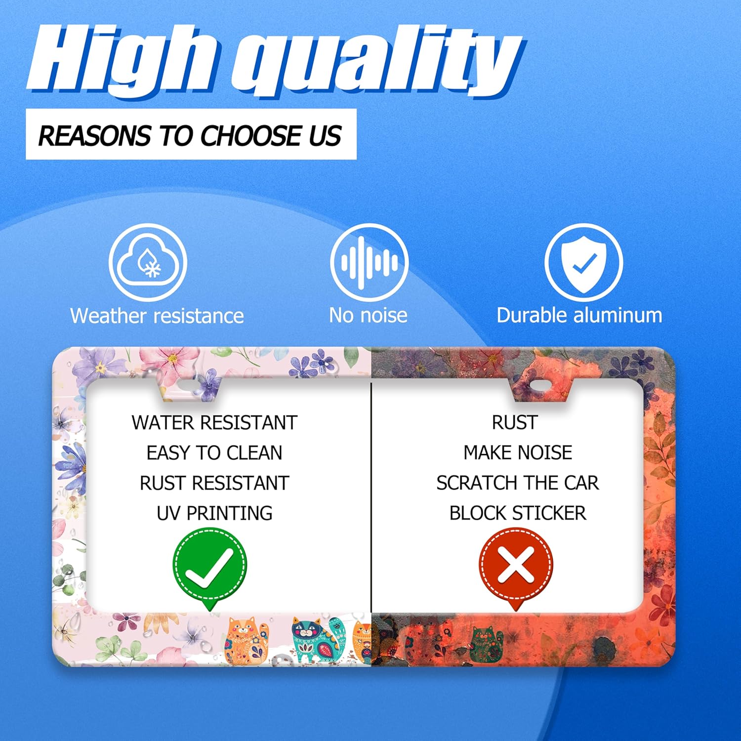 Cat and Flowers License Plate Frame Beautiful Floral Animals License Plate Stainless Steel Funny License Plate Holder for Men Women Colorful Cats Car Accessories Decoration 12.3" x 6.3"