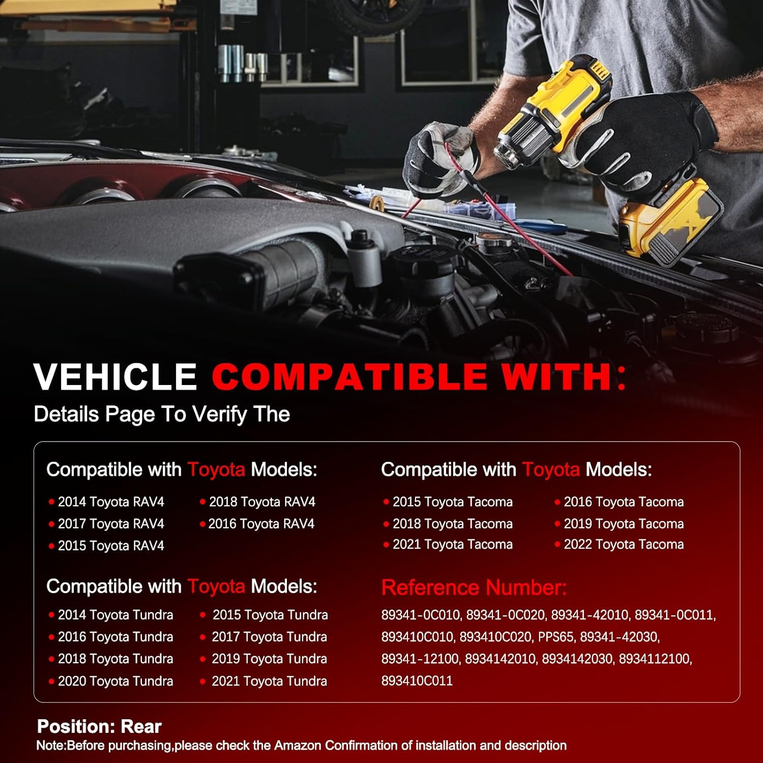 - Fitment:Parking assist sensor Compatible 2014-2018 Toyota RAV4 (Rear; Built In US);Compatible with 2015-2022 Toyota Tacoma (Rear);Compatible with 2014-2021 Toyota Tundra---(Rear Outer/Rear Inner/Front; without Rubber Spacer)--Rear Bumper Park Assist Object Sensors.Note:Before purchasing,please check the Amazon Confirmation of installation and description details page to verify the compatibility of this item with your vehicle.