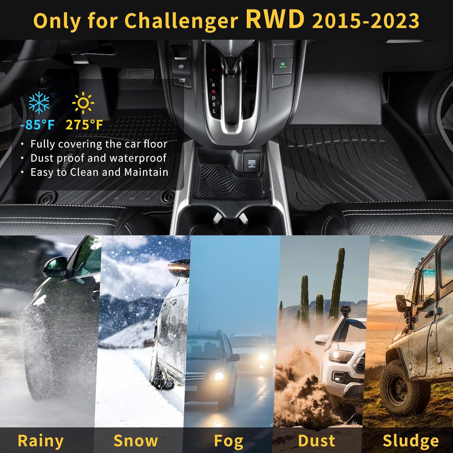 - ăSoft & Durable TPE Rubberă Floor Mats for Dodge Challenger 2015 TPE material is extremely malleable and durable, non-slip and anti-friction, soft and waterproof.