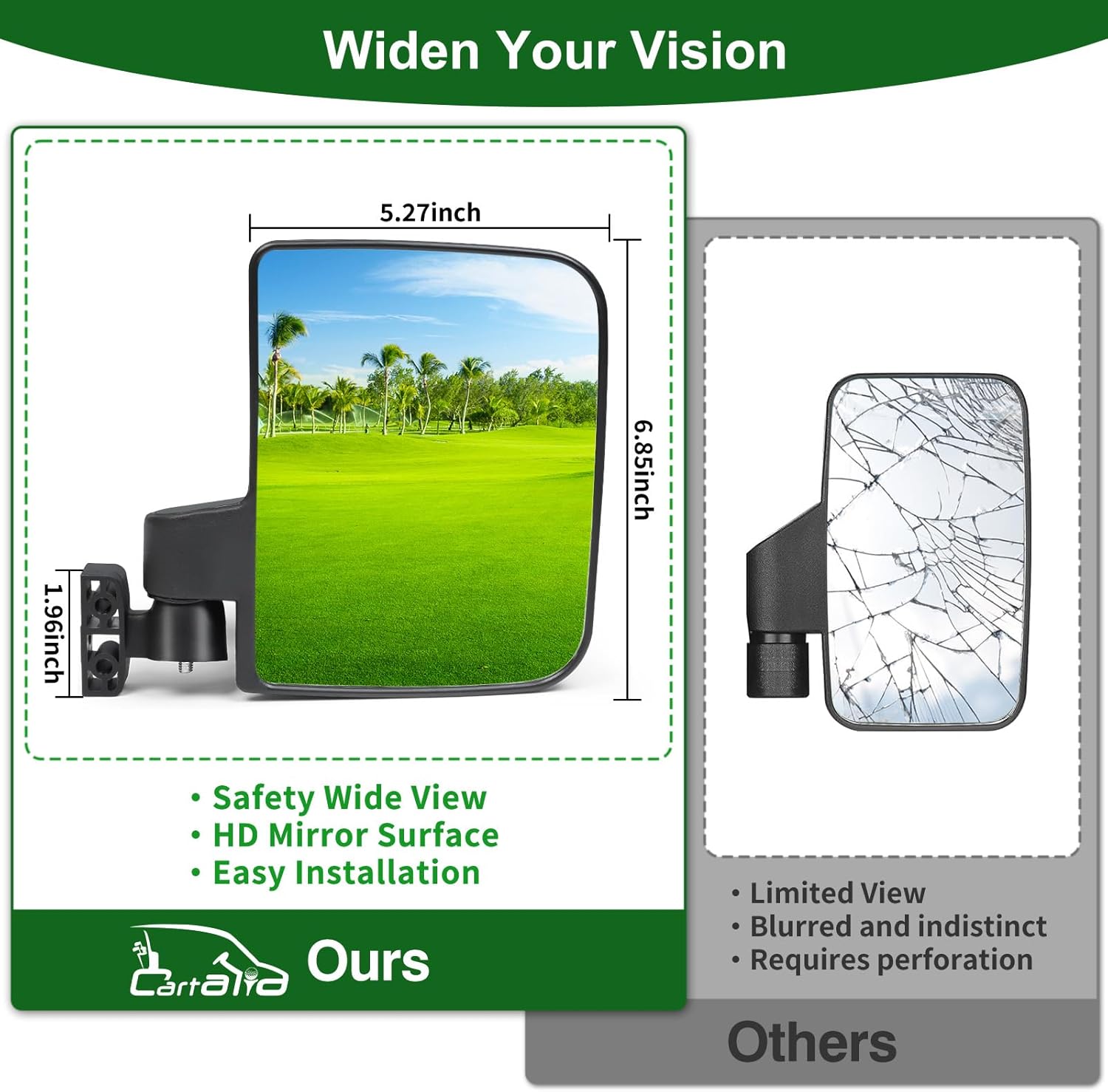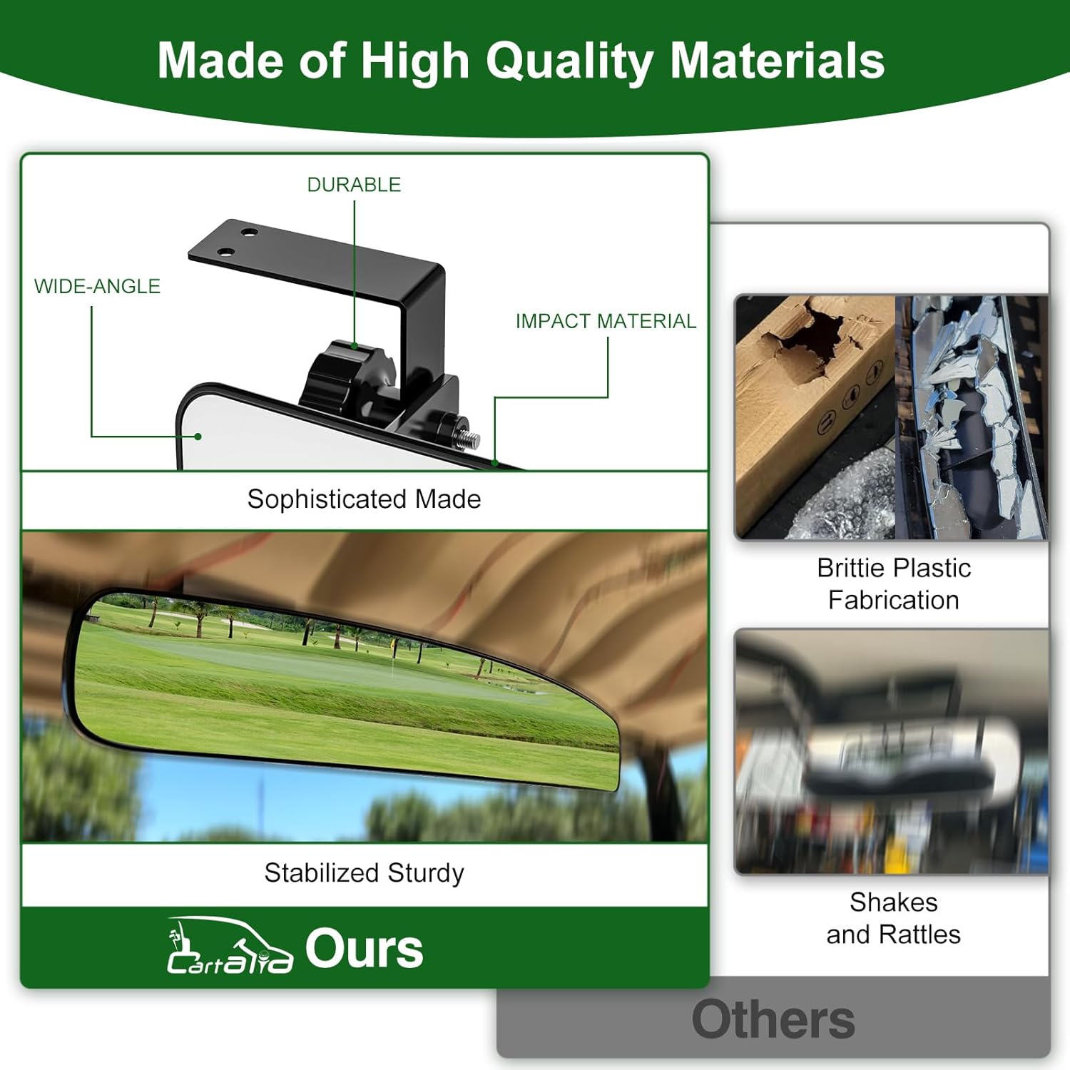 - Unique - The golf cart side mirror is made of high impact resistant PP and ABS materials with HD shatterproof tempered glass and bracket. It is anti-friction and corrosion resistant, suitable for all kind of weather condition