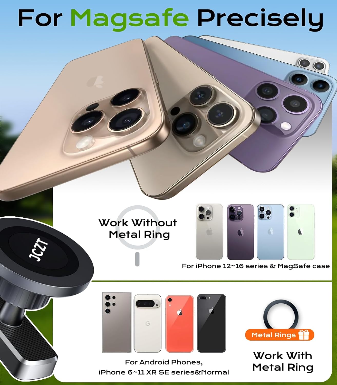 - Wide Compatibility: The JCZT golf phone holder can be directly attached to iPhone 16, 15, 14, 13, 12 series and is compatible with magnetic phone cases. In addition, it also works with non-magnetic phones and standard phone cases with a metal ring on the back (included in the package)